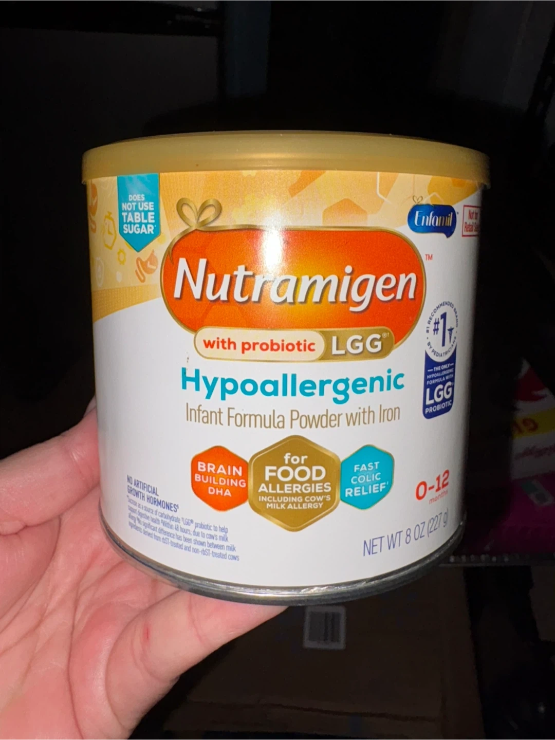 60Selling a can of Nutramigen Hypoallergenic Infant Formula Powder. This formula contains probiotic LGG to help with digestive health. It's designed for babies 0-12 months and provides brain building DHA, food allergy support including cow's milk allergy, and fast colic relief. Net weight is 8 oz (227 g)