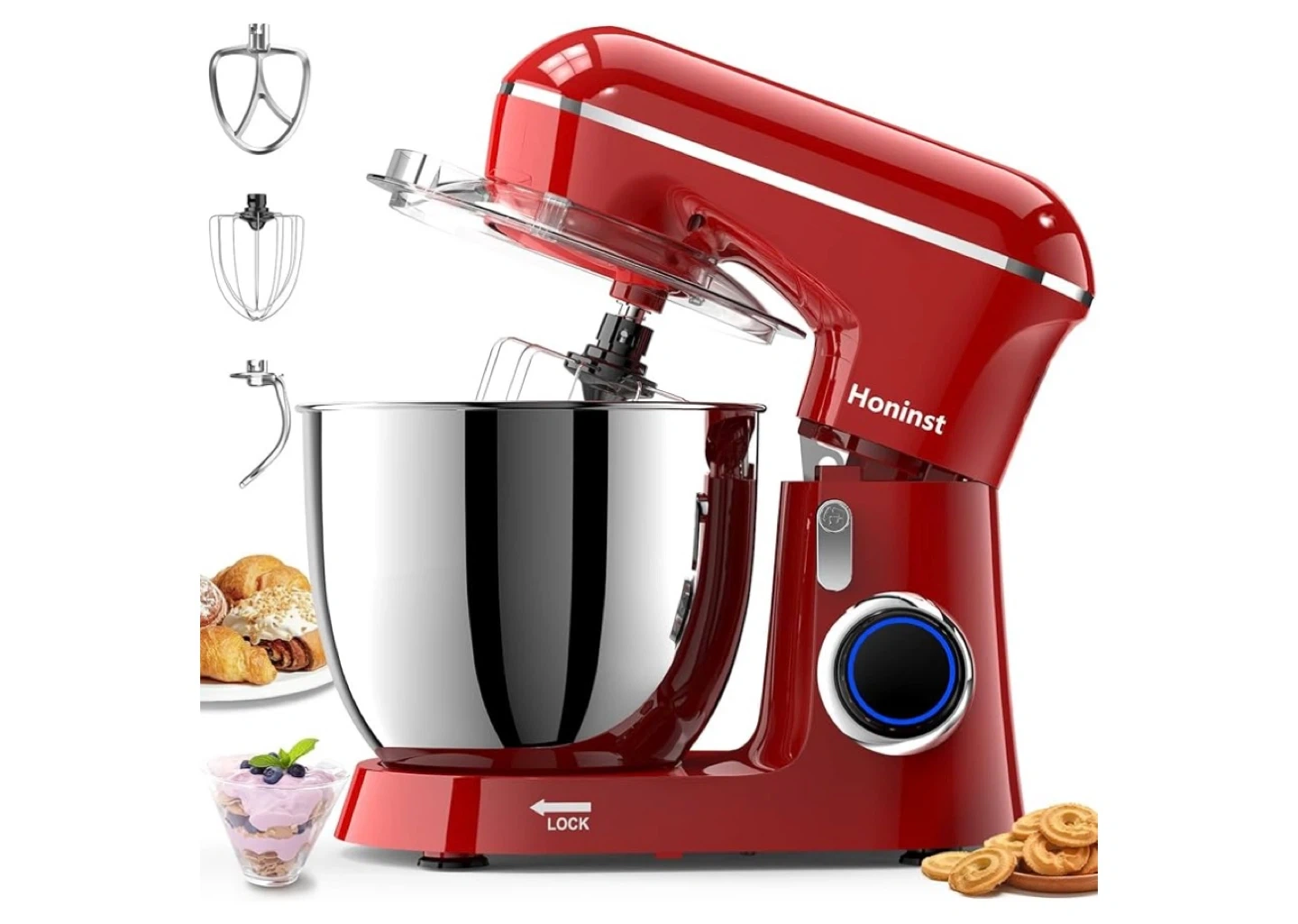 This is a red Honinst stand mixer. It includes a dough hook, whisk, and beater. Stainless steel bowl.