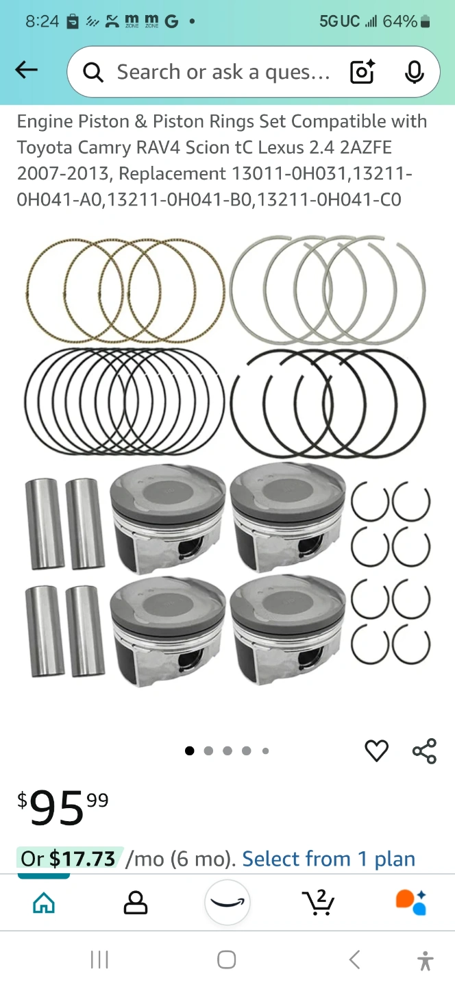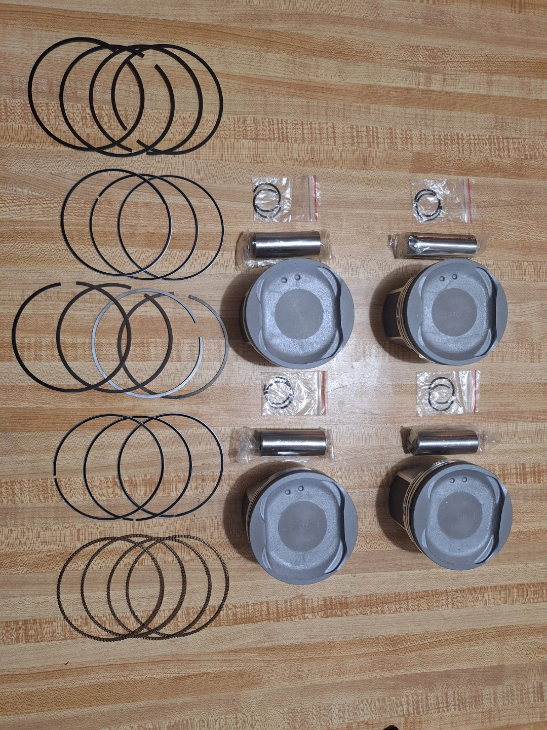 10Complete engine piston and rings set. Compatible with 2007-2013 Toyota Camry, RAV4, Scion tC, Lexus. 2.4L 2AZFE engine. Replacement parts numbers: 13011-0H031, 13211-0H041-A0, 13211-0H041-B0, 13211-0H041-C0. Four pistons and full sets of rings.