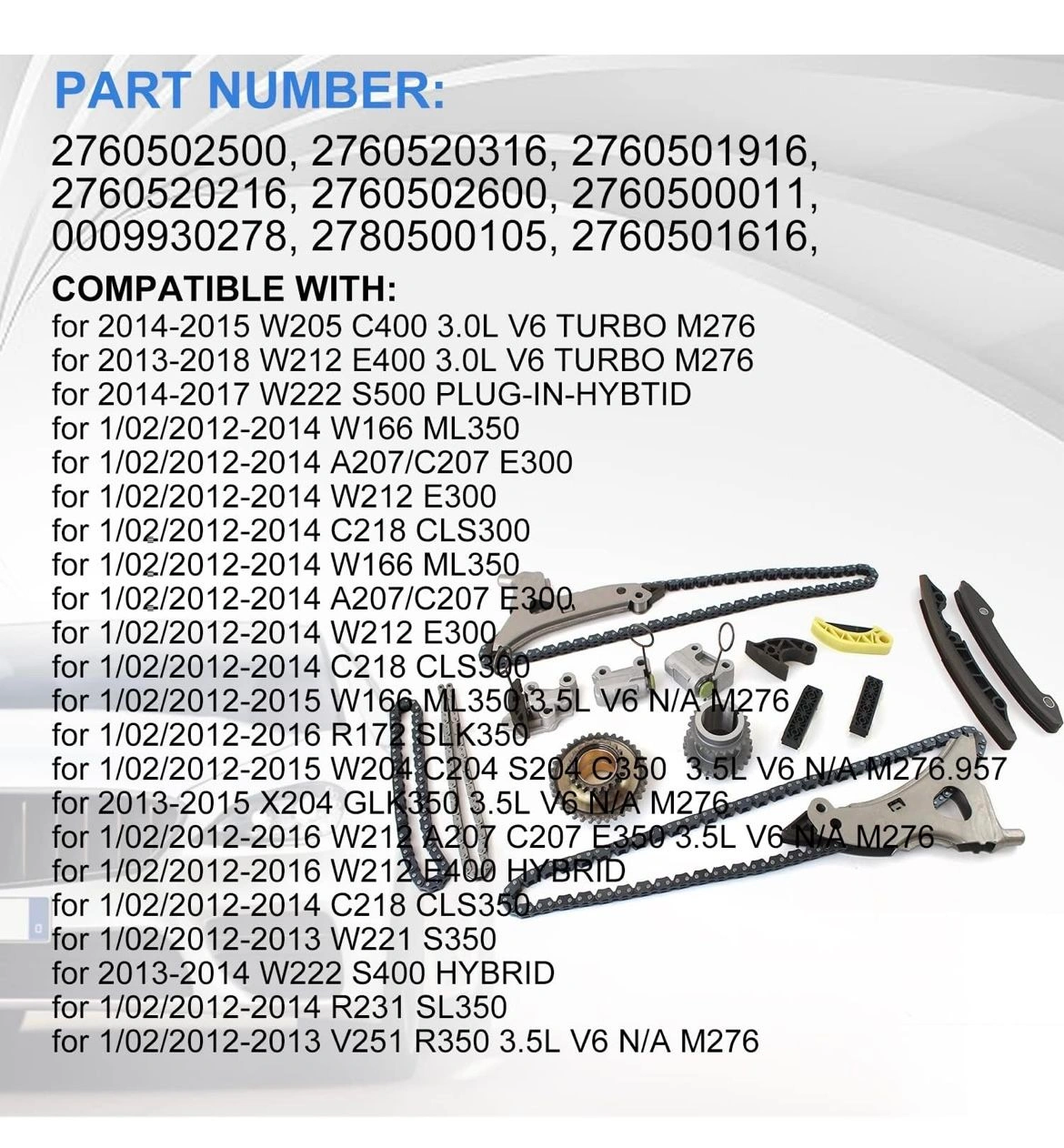 15Open box, all pieces are present Engine Timing Chain Kit - with Gear Tensioners Guide Rails Fits for Mercedes E350 GL450 E400 ML350 GLK350 M276 3.0L 3.5L V6, Replace OE (contact info removed)100,(contact info removed)316,(contact info removed)611,(contact info removed)116