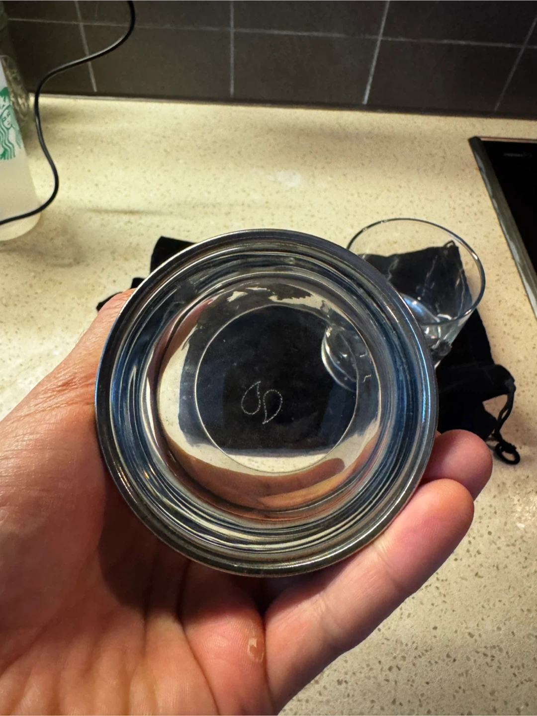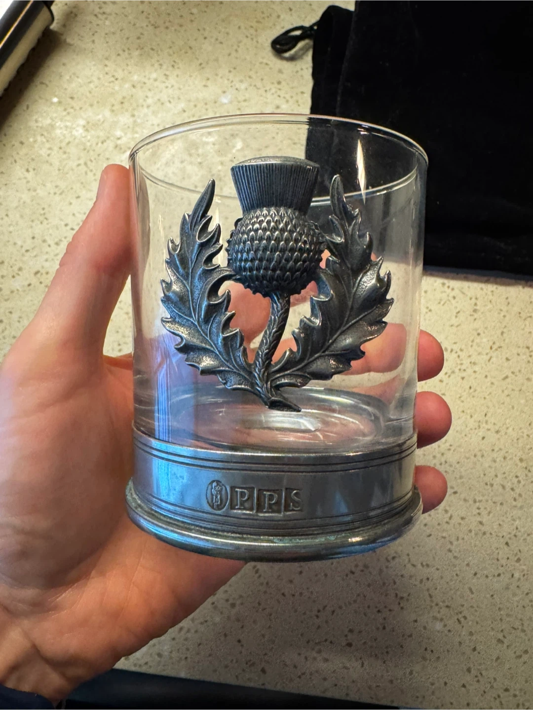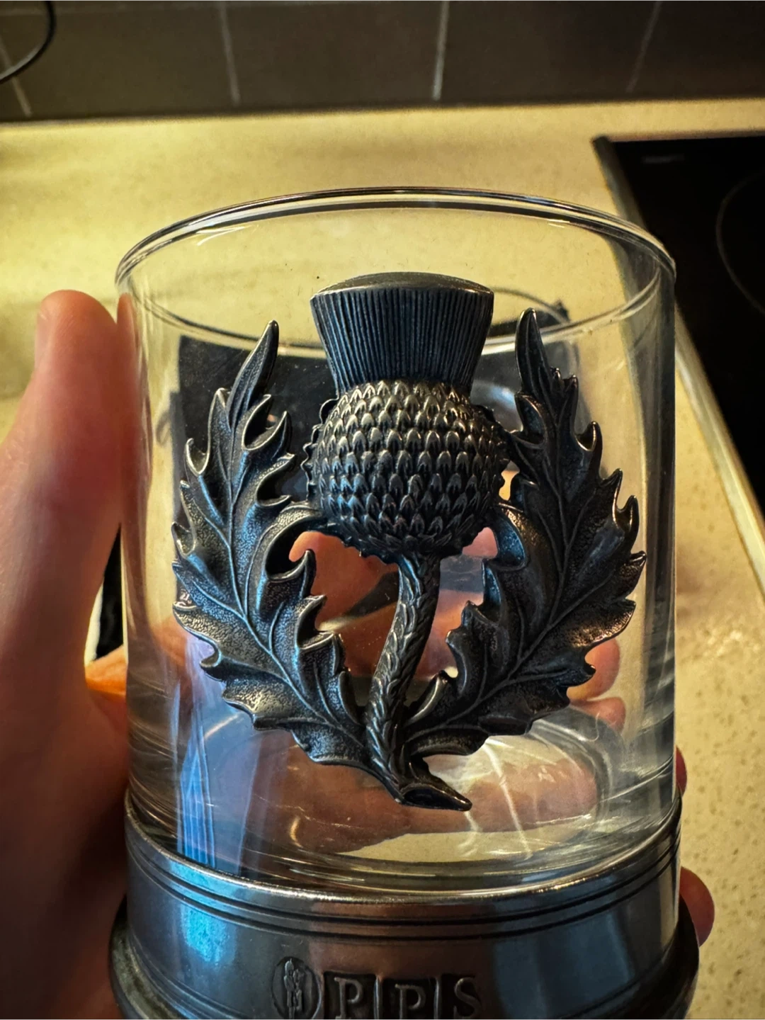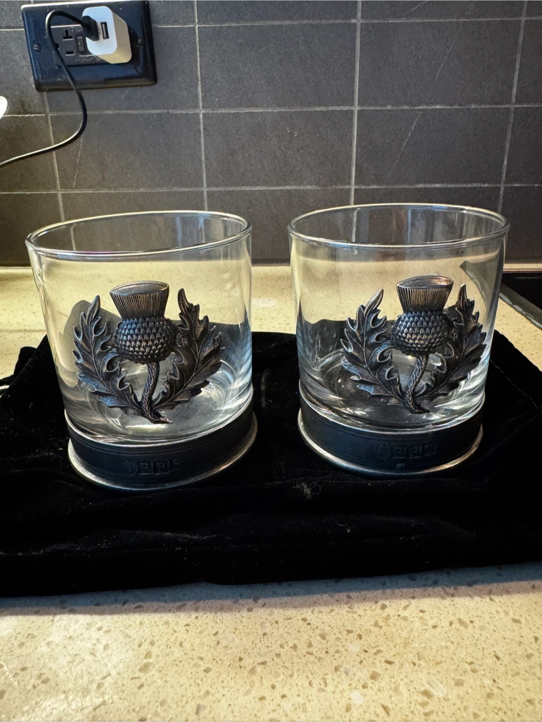Selling a pair of whiskey glasses with a pewter base and a pewter thistle emblem. The base has 'EPC' engraved on it which is the mark of the English Pewter Co. Price is for the set of two.