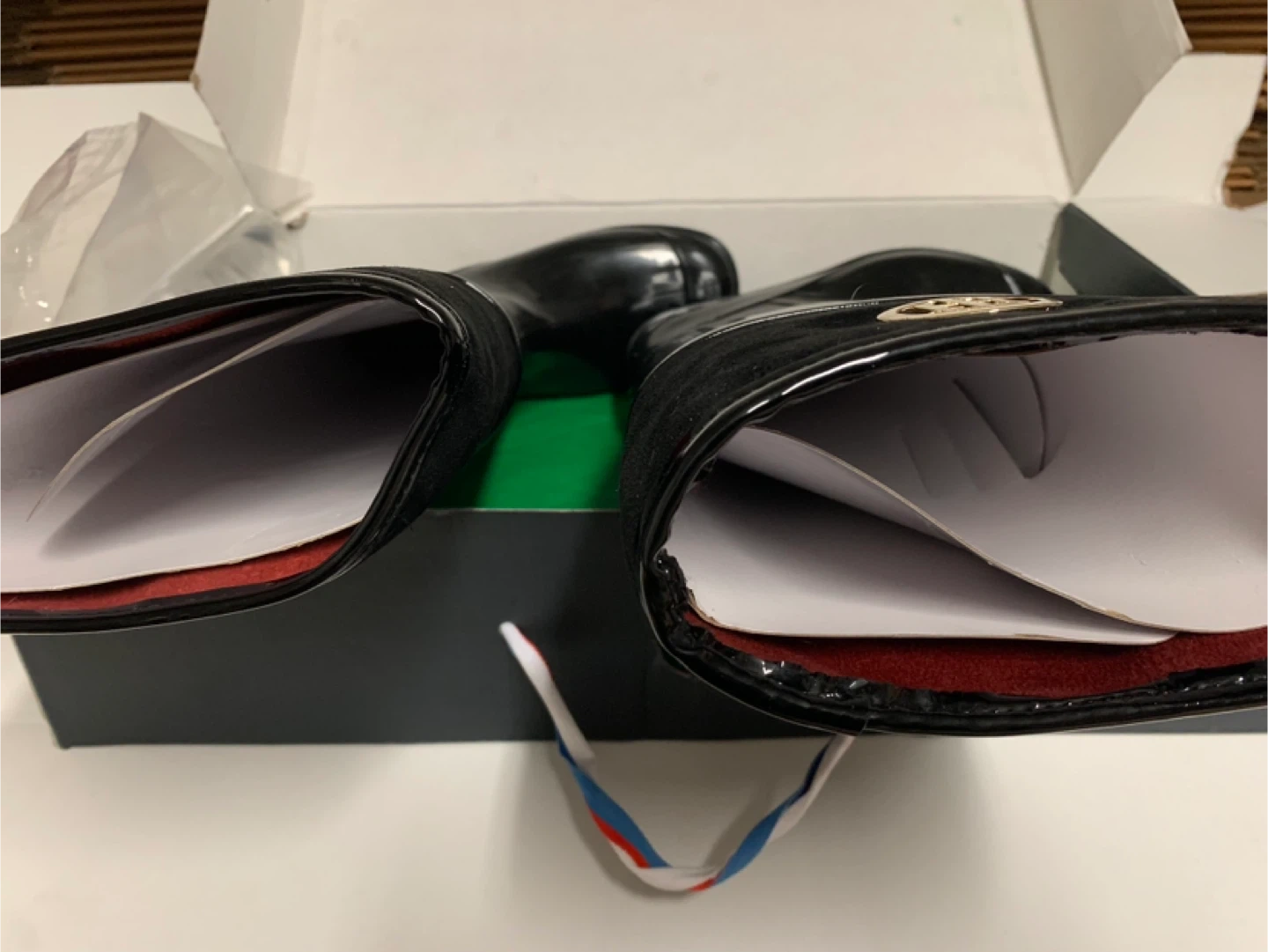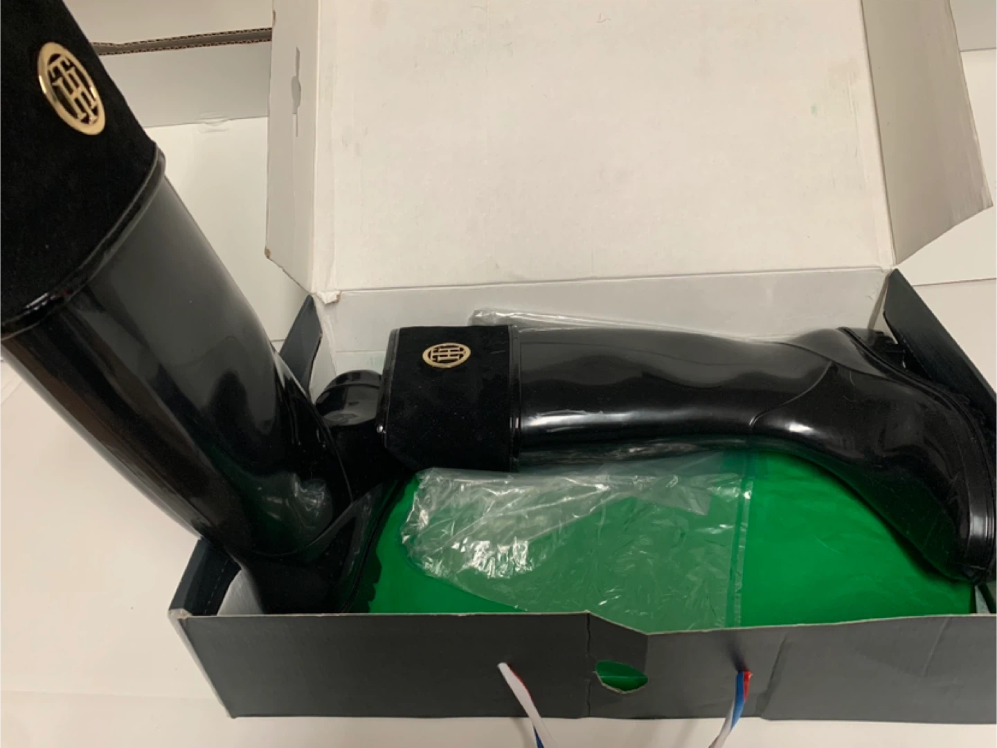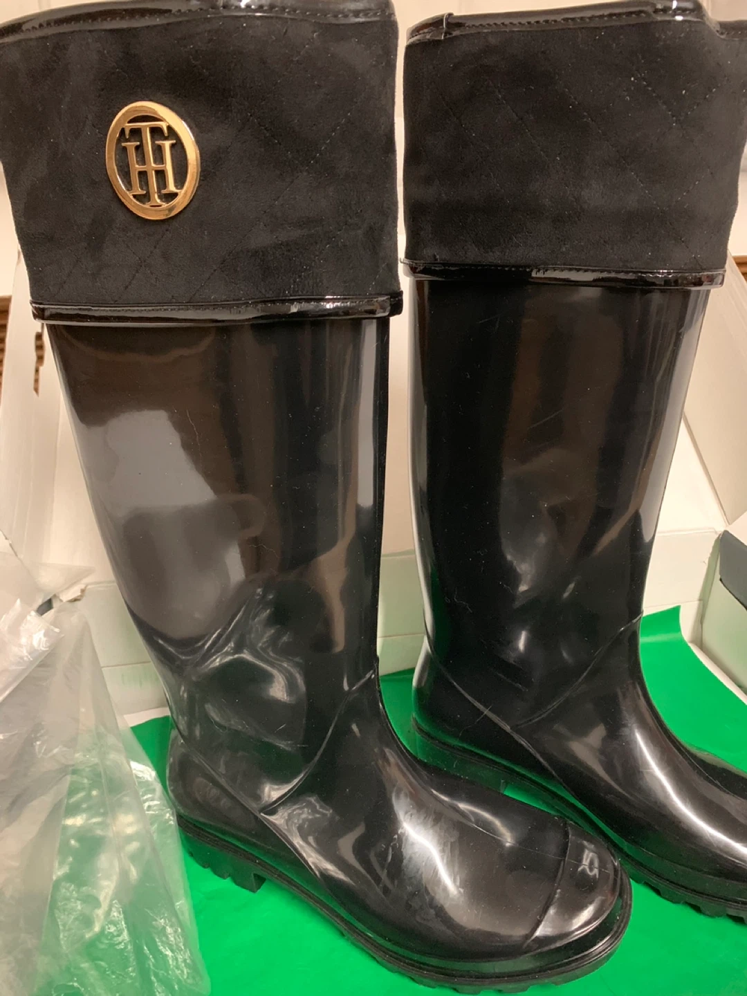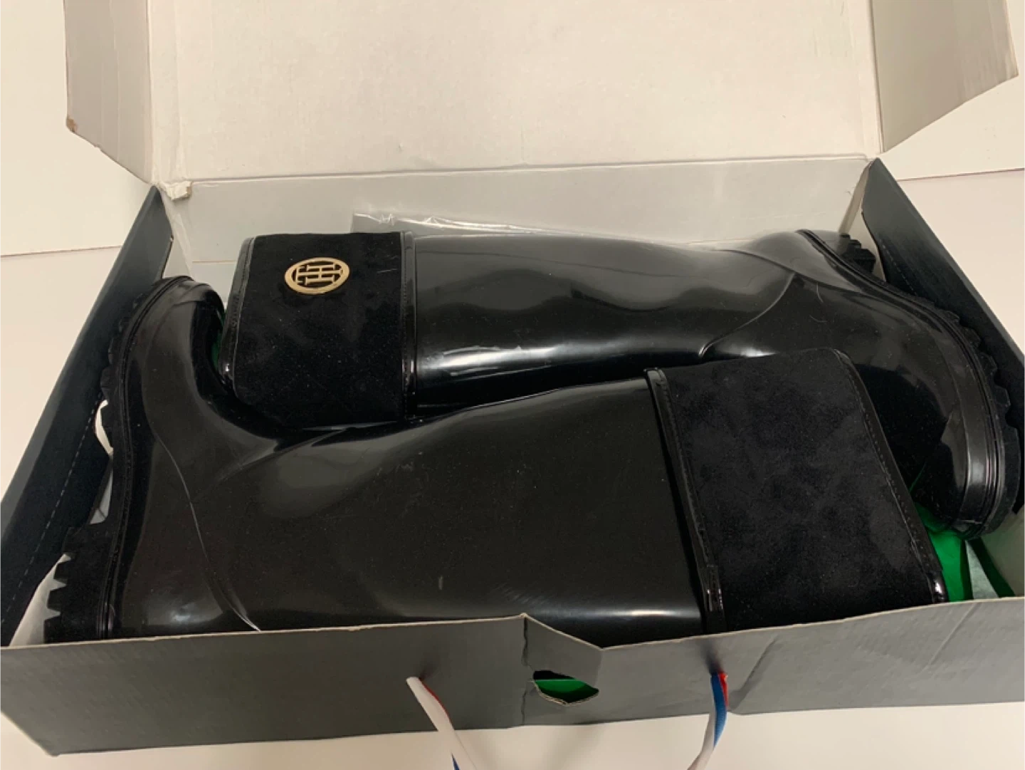 Classic black rain boots from Tommy Hilfiger. Feature a faux suede cuff with a gold emblem. Includes original box.