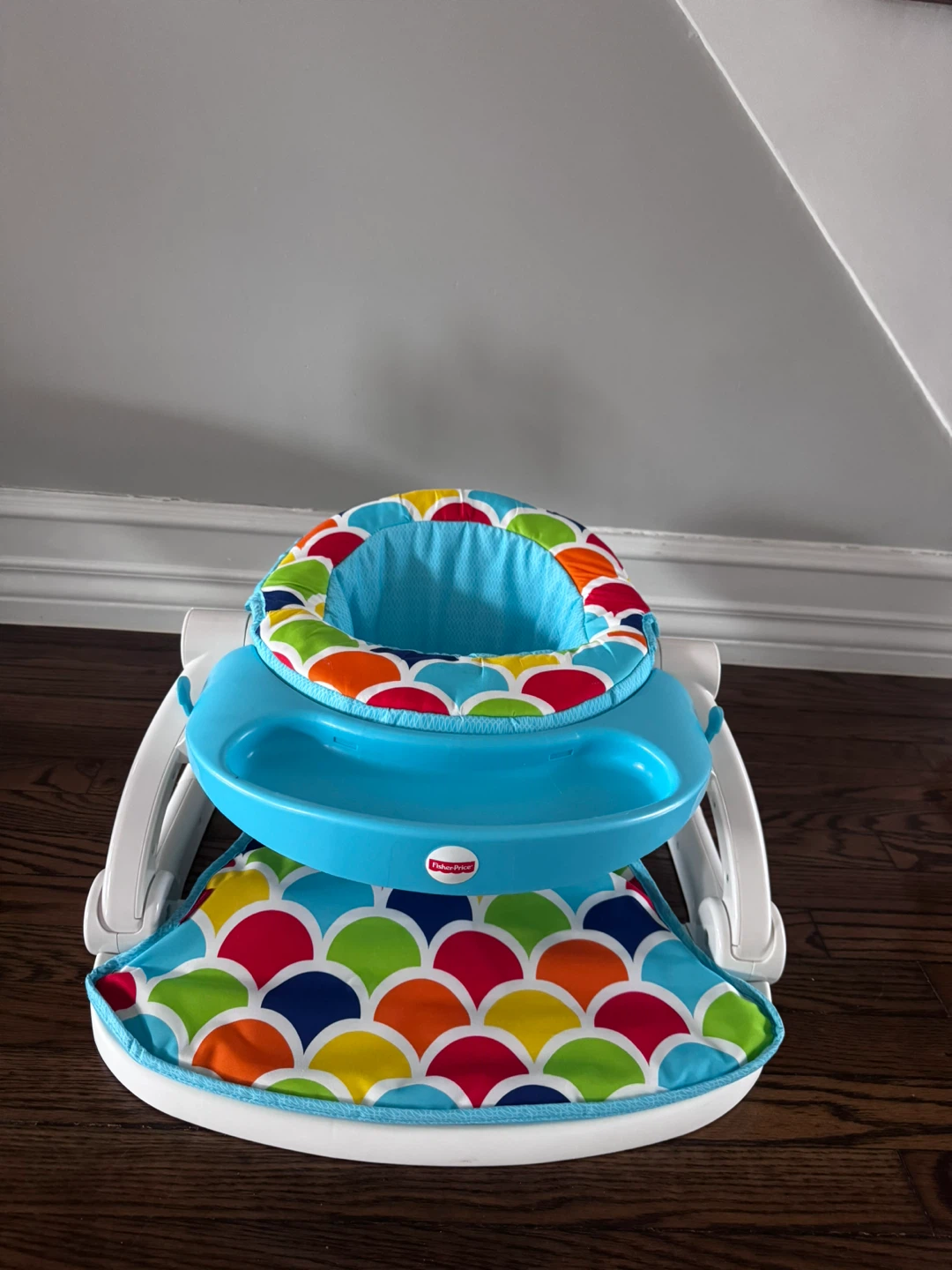 This Fisher-Price Sit-Me-Up seat is designed for babies. It features a colorful, scalloped pattern and a blue tray. It's a convenient seat for your little one to relax in.