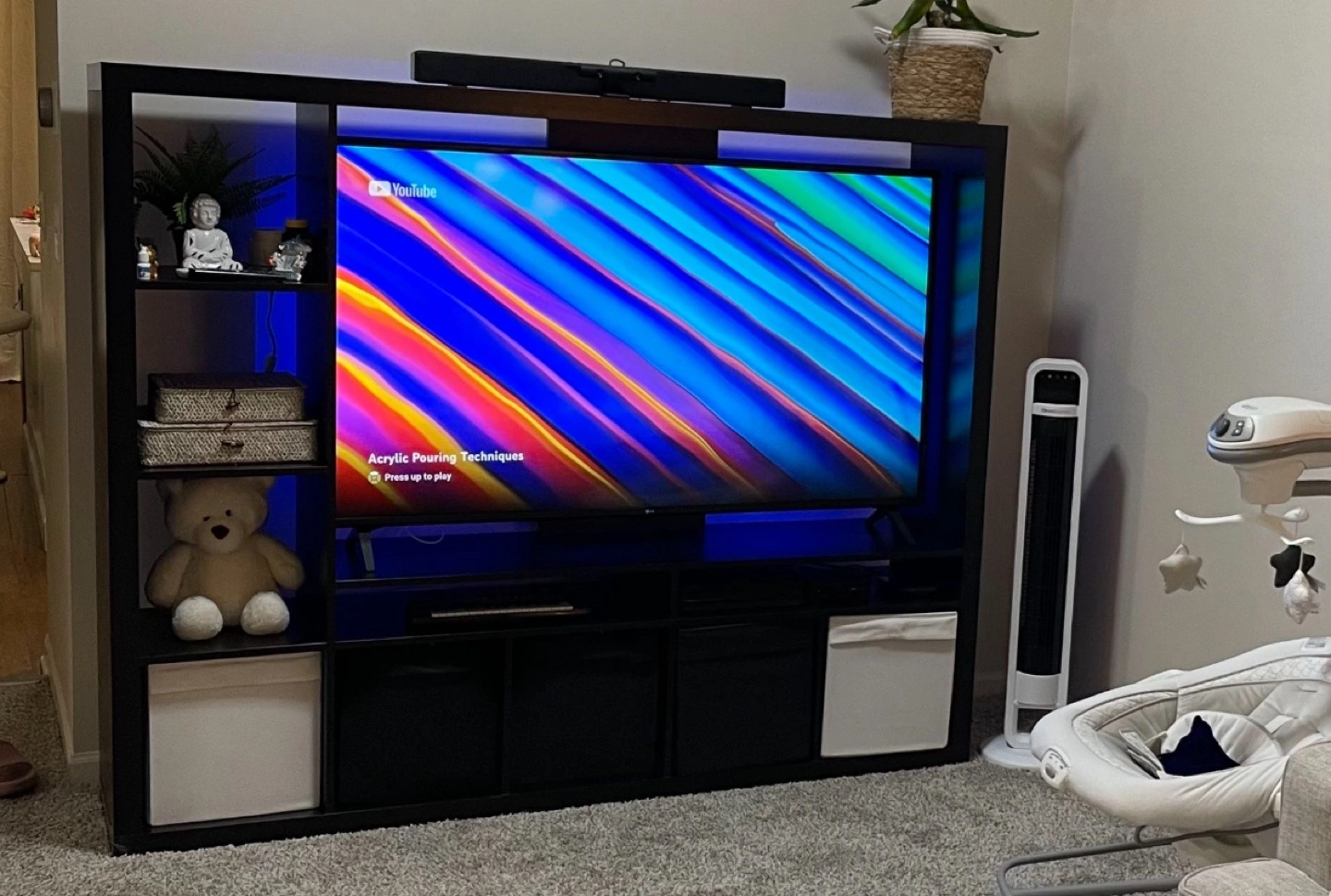 Black shelving unit. Features shelves, storage cubes, and a built-in space for a television. The unit has a minimalist design. I think you might enjoy watching a movie on this unit in the evening.
