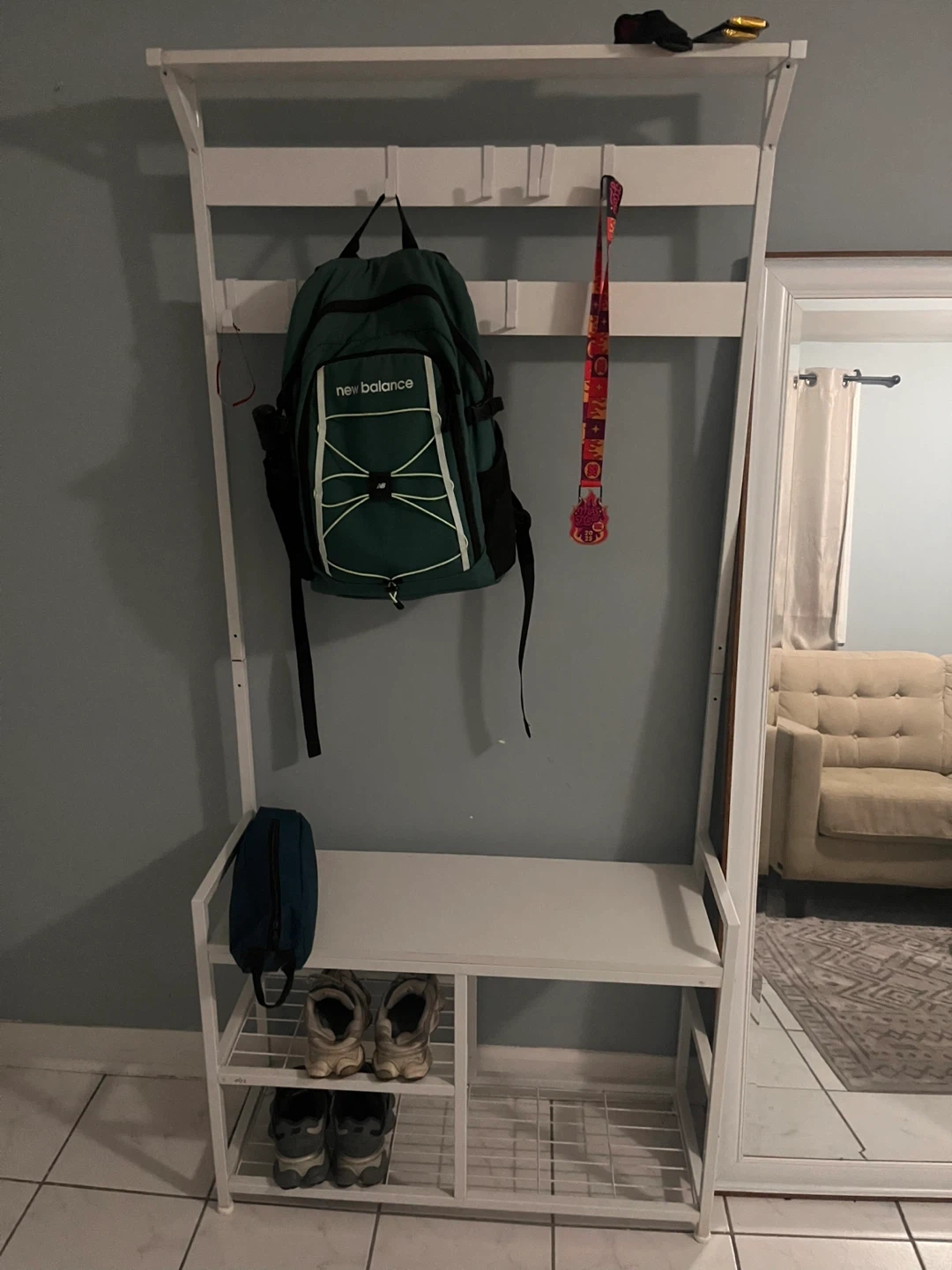 10I'm selling a hall tree with a bench and hooks! It's white and in great condition. There's plenty of room for shoes on the bottom shelves, and the hooks are perfect for hanging coats and bags. It's a great way to keep your entryway organized