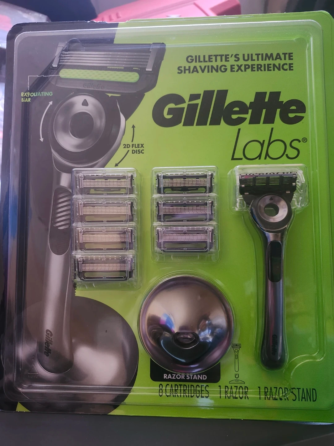 This Gillette Labs razor kit includes 8 replacement cartridges, one razor handle, and a razor stand. It features an exfoliating bar and a 2D flex disc for an ultimate shaving experience. The razor and cartridges are new in their original packaging.