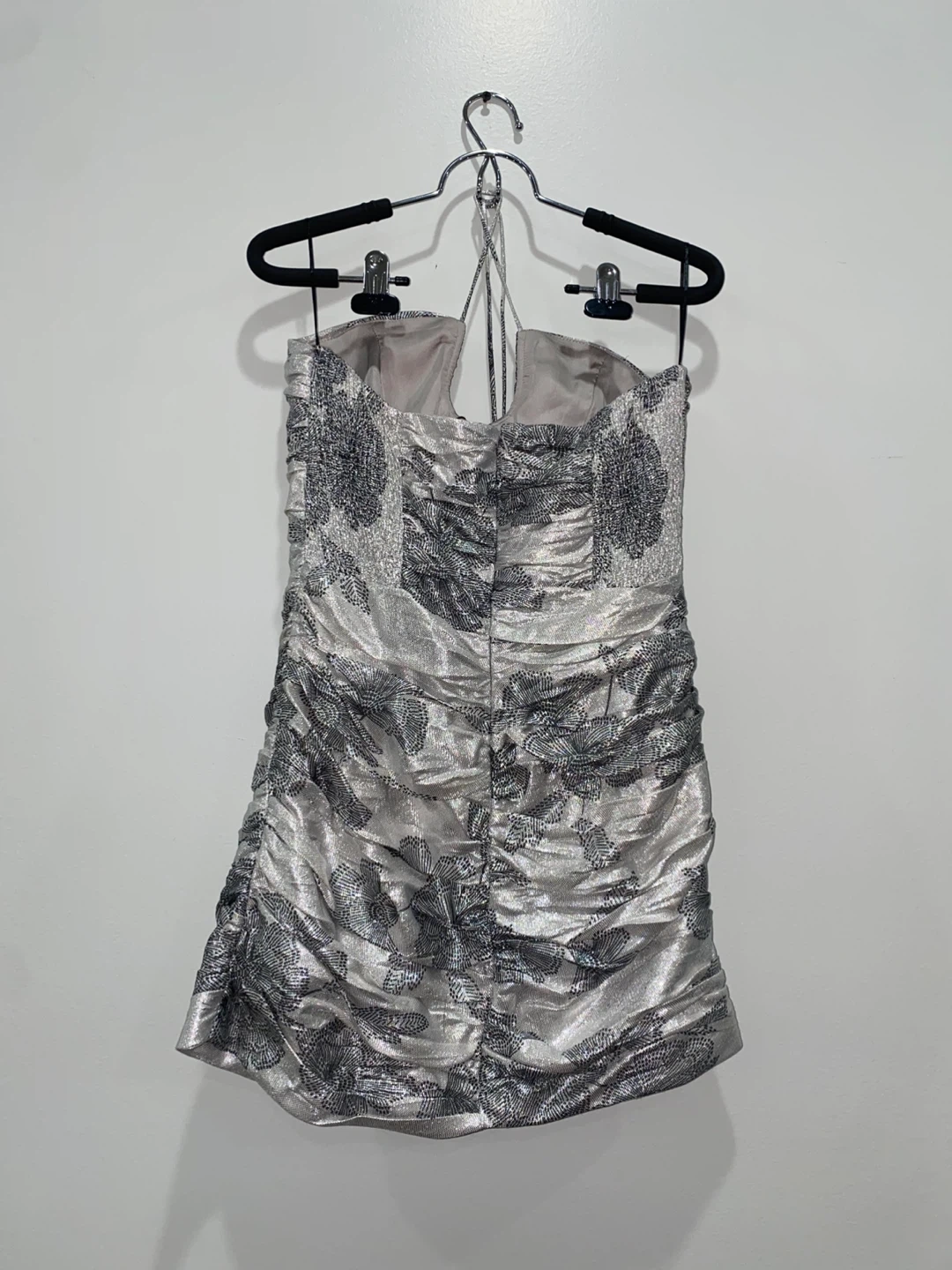 This Zara halter neck mini dress features a metallic silver fabric with a dark gray leaf-like pattern. It's ruched all over for a flattering fit and has a tie halter neckline. Originally priced at $119.00.