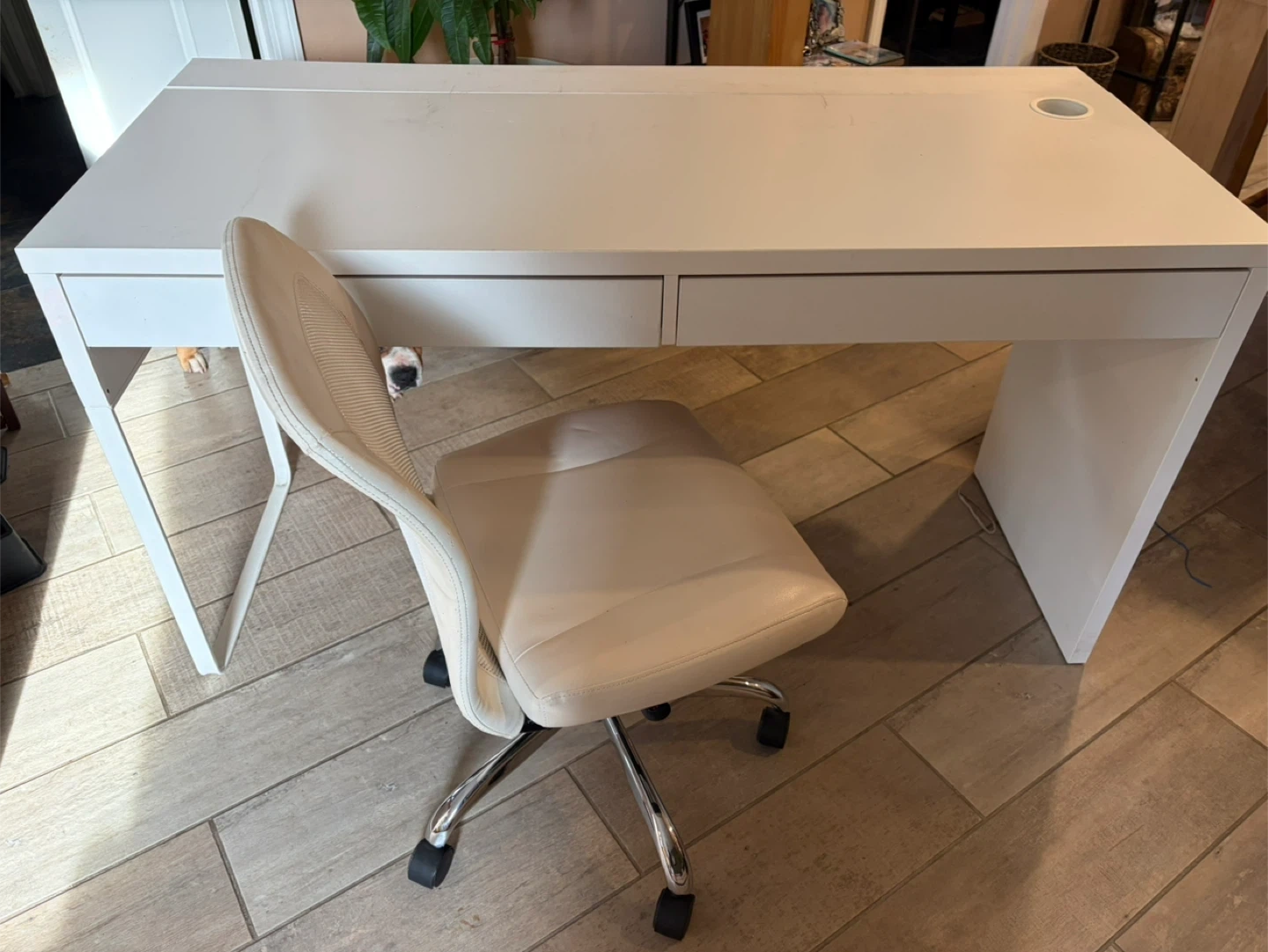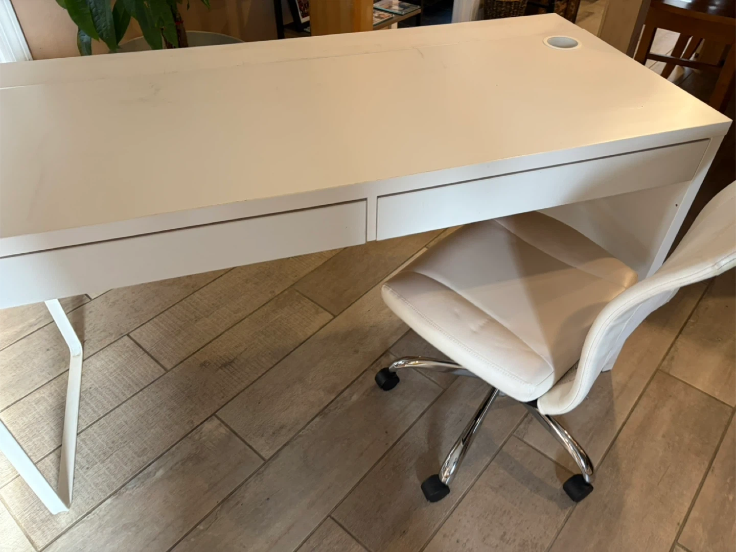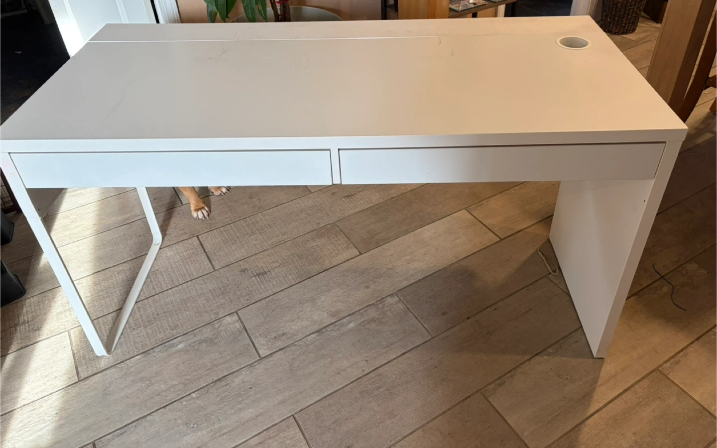 A simple white desk featuring two spacious drawers for storage. It also has a built-in cable management hole on the desktop for a tidy setup. The minimalist design makes it a versatile addition to any room. With hair
