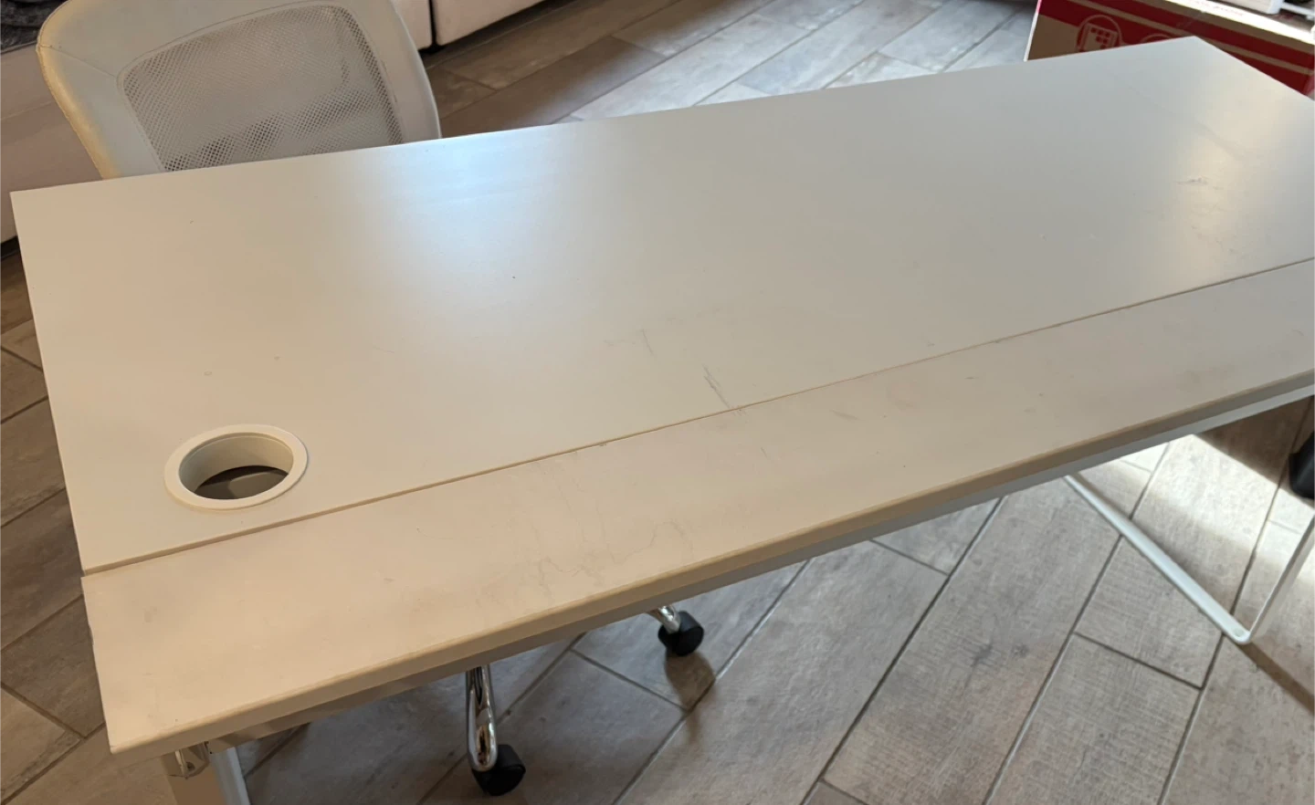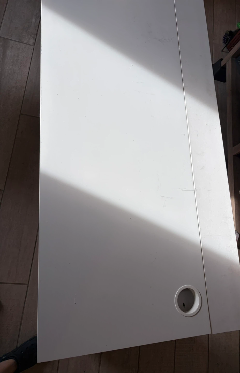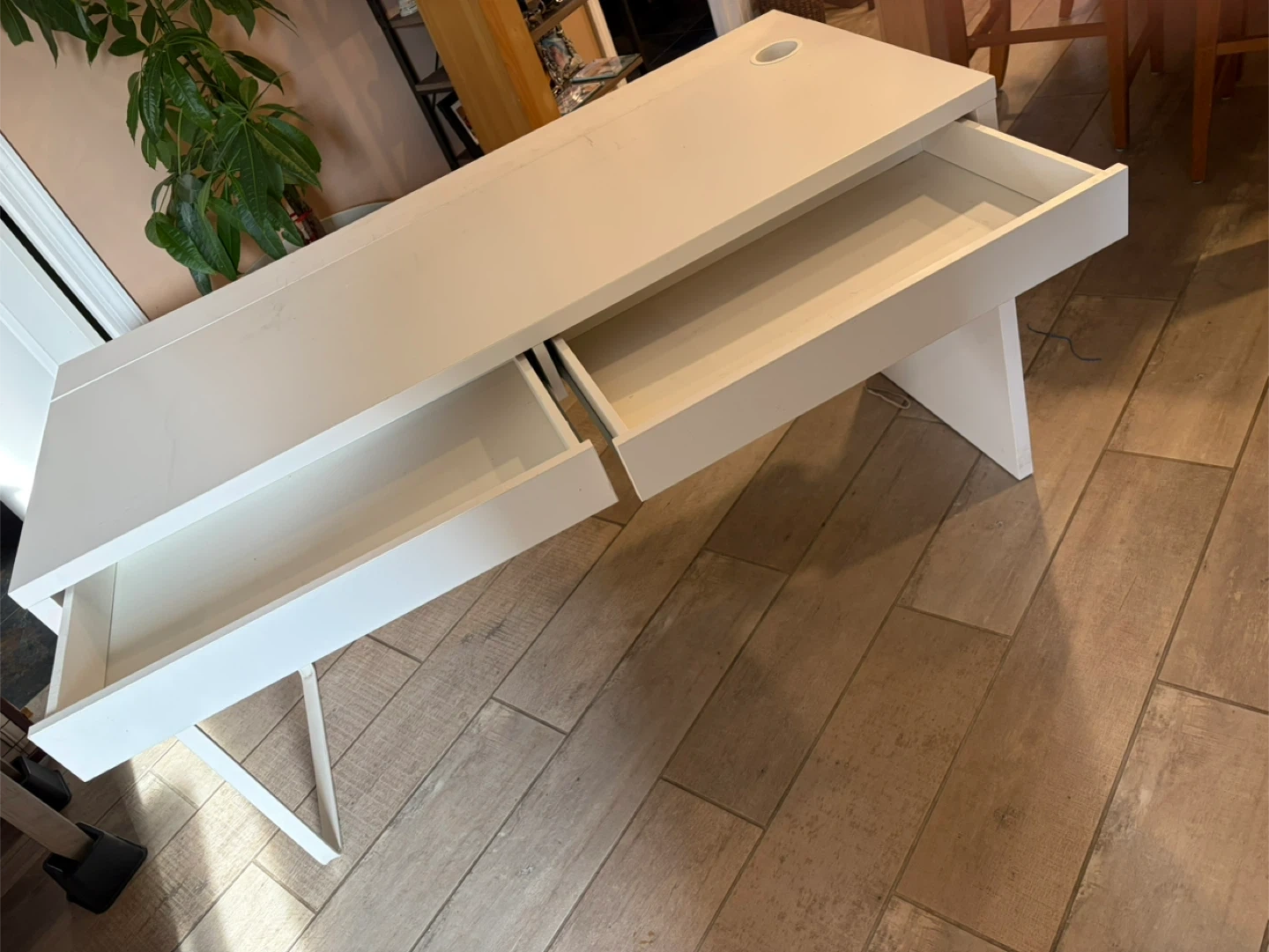 A simple white desk featuring two spacious drawers for storage. It also has a built-in cable management hole on the desktop for a tidy setup. The minimalist design makes it a versatile addition to any room. With hair