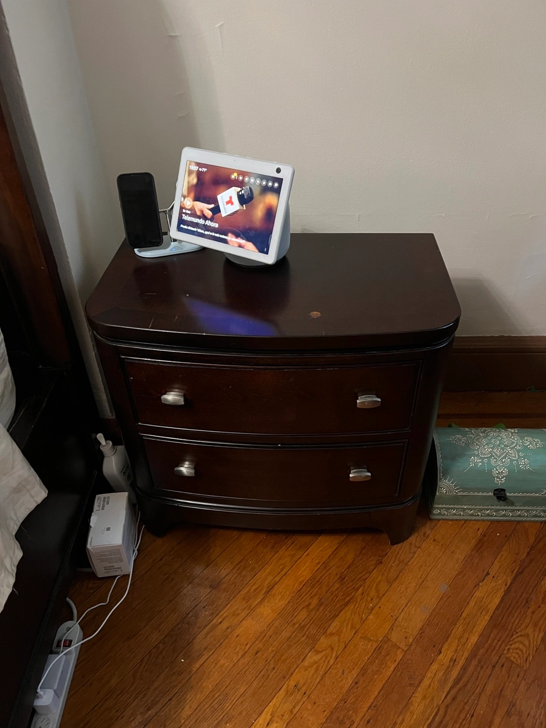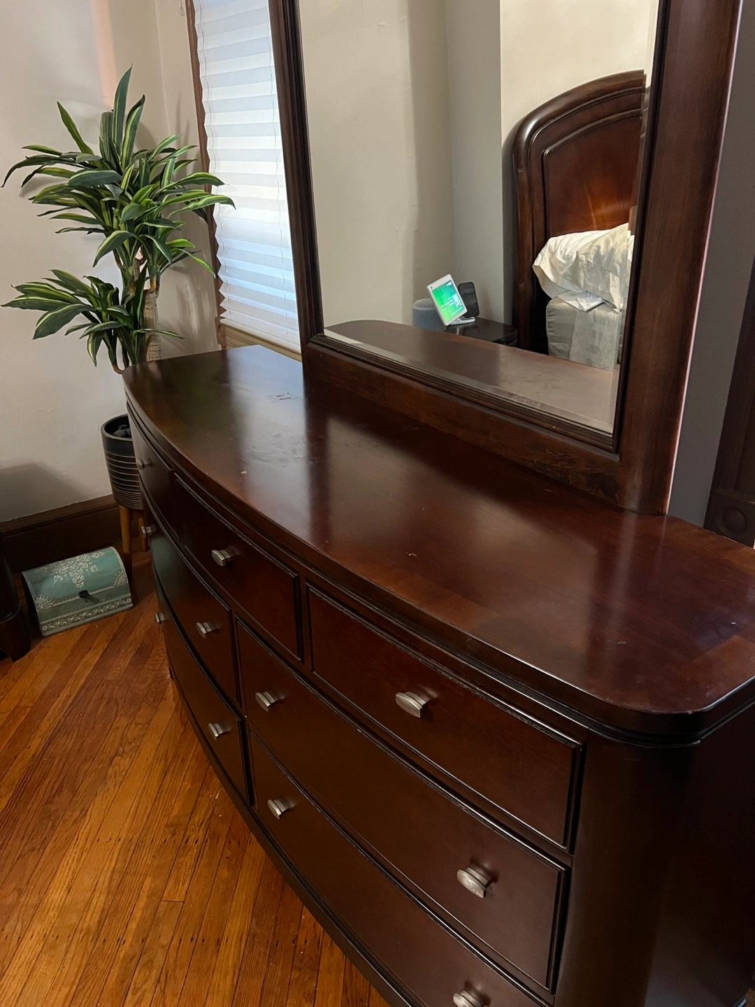 Beautiful dark wood bedroom set. Includes a dresser with mirror and a nightstand. Seven drawers on the dresser. Two drawers on the nightstand. Curved design. Solid wood construction. Needs some DYI on the top , granddaughter dropped scent oil on the top by accident still a great deal only the mirror cost me more than $375