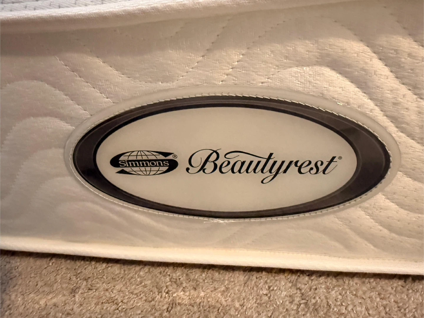 This is a Simmons Beautyrest mattress. It's white with a patterned quilted top. Includes side handles for easier moving.