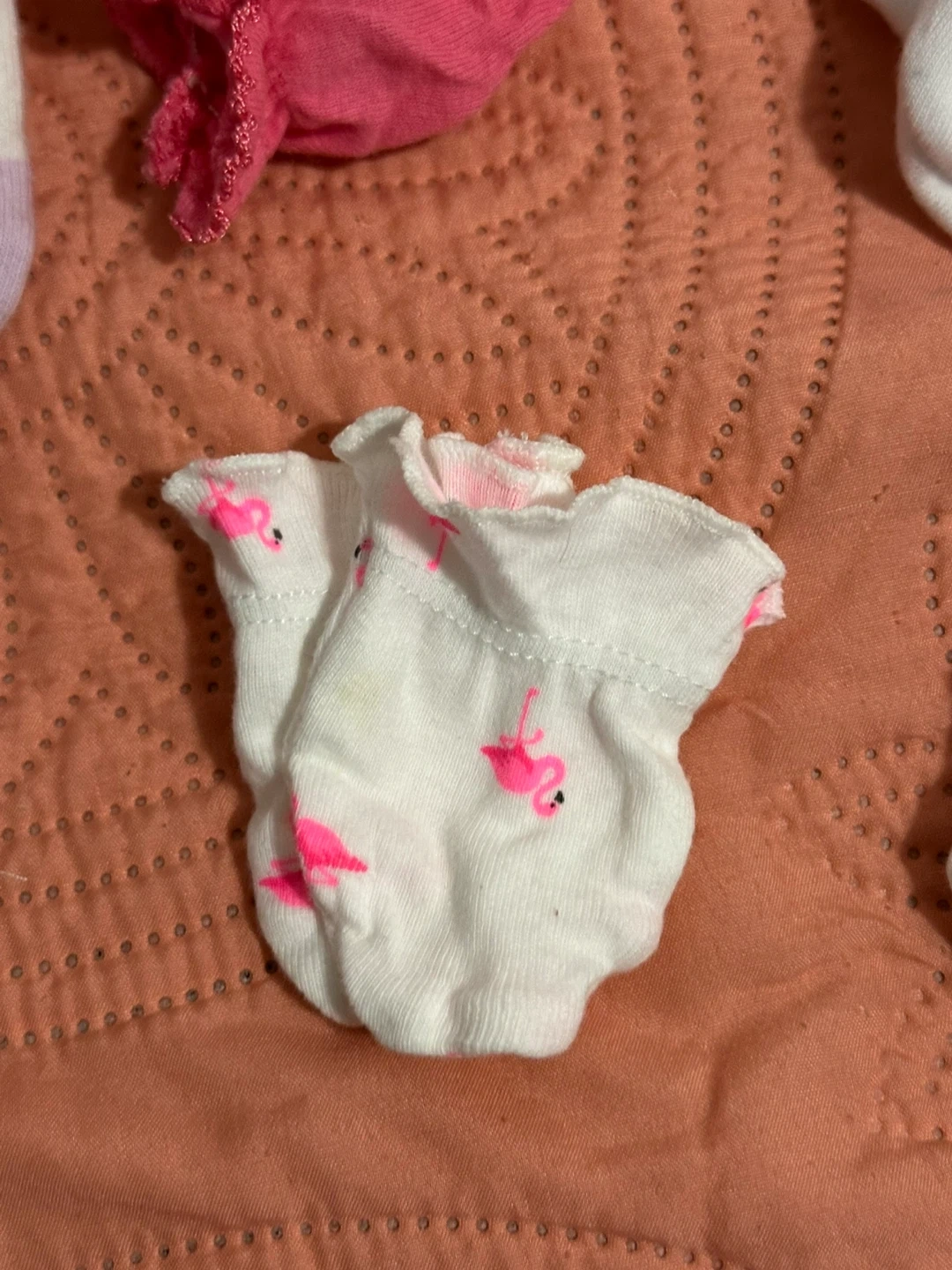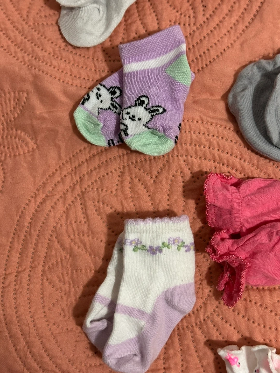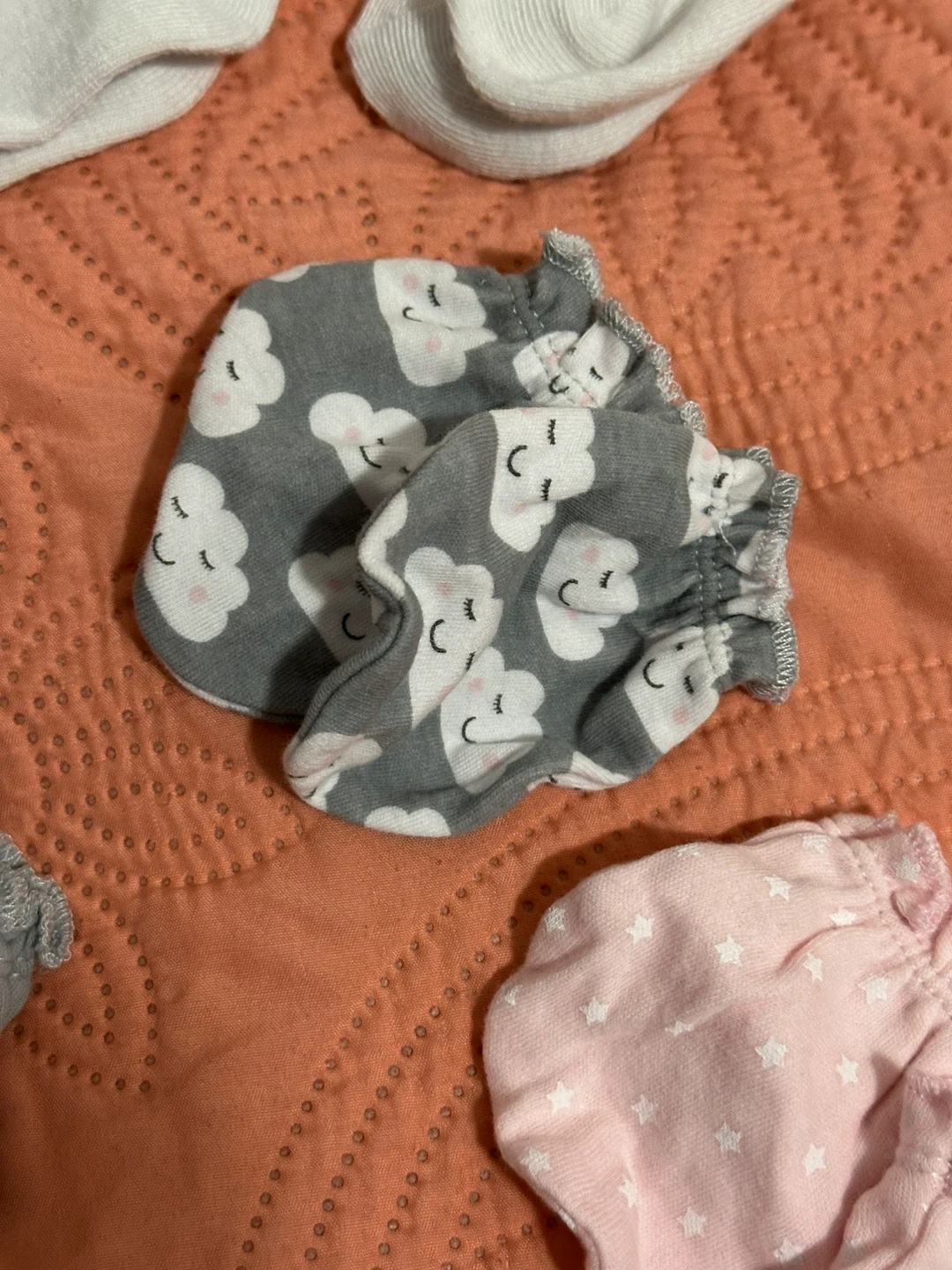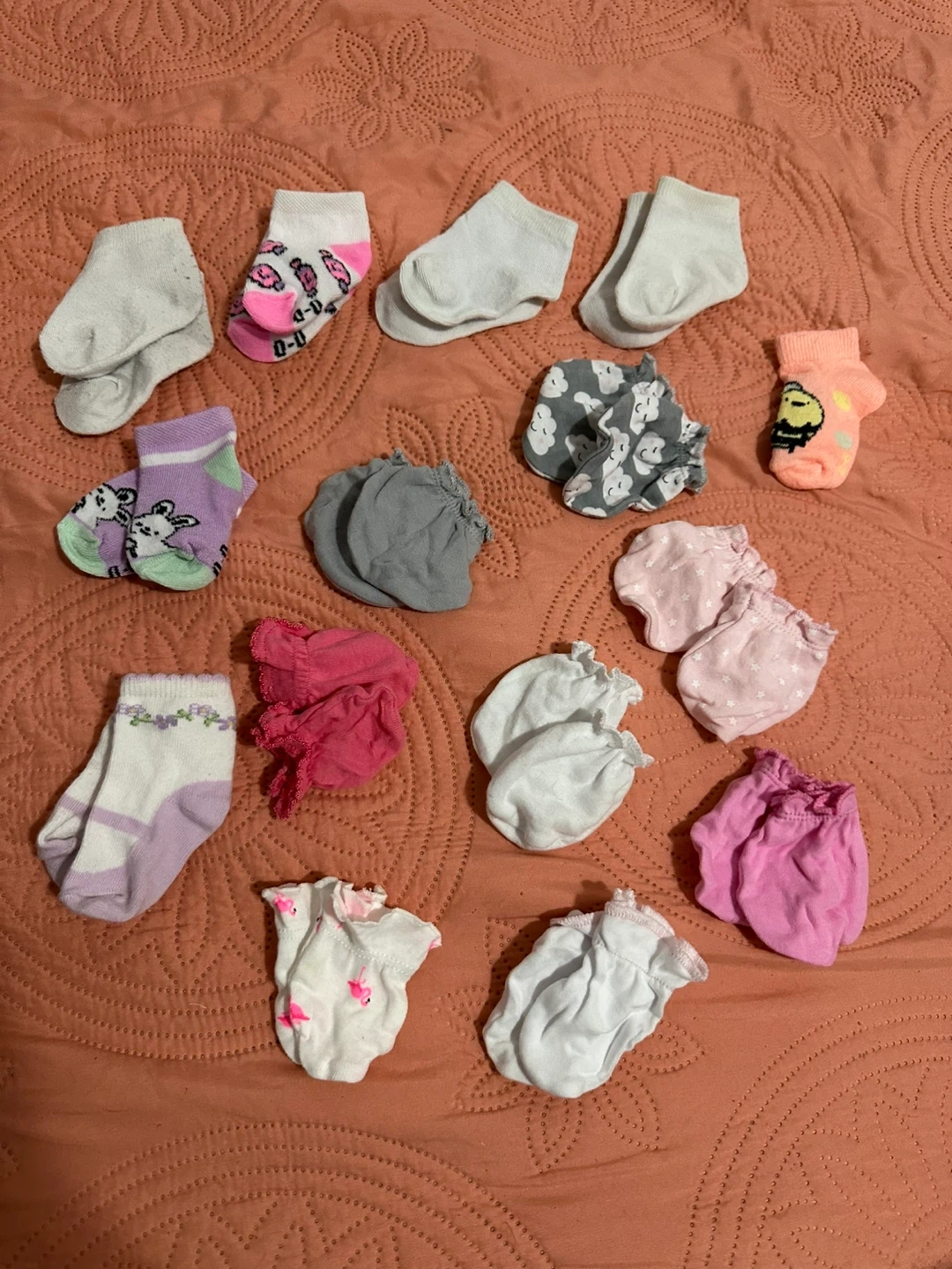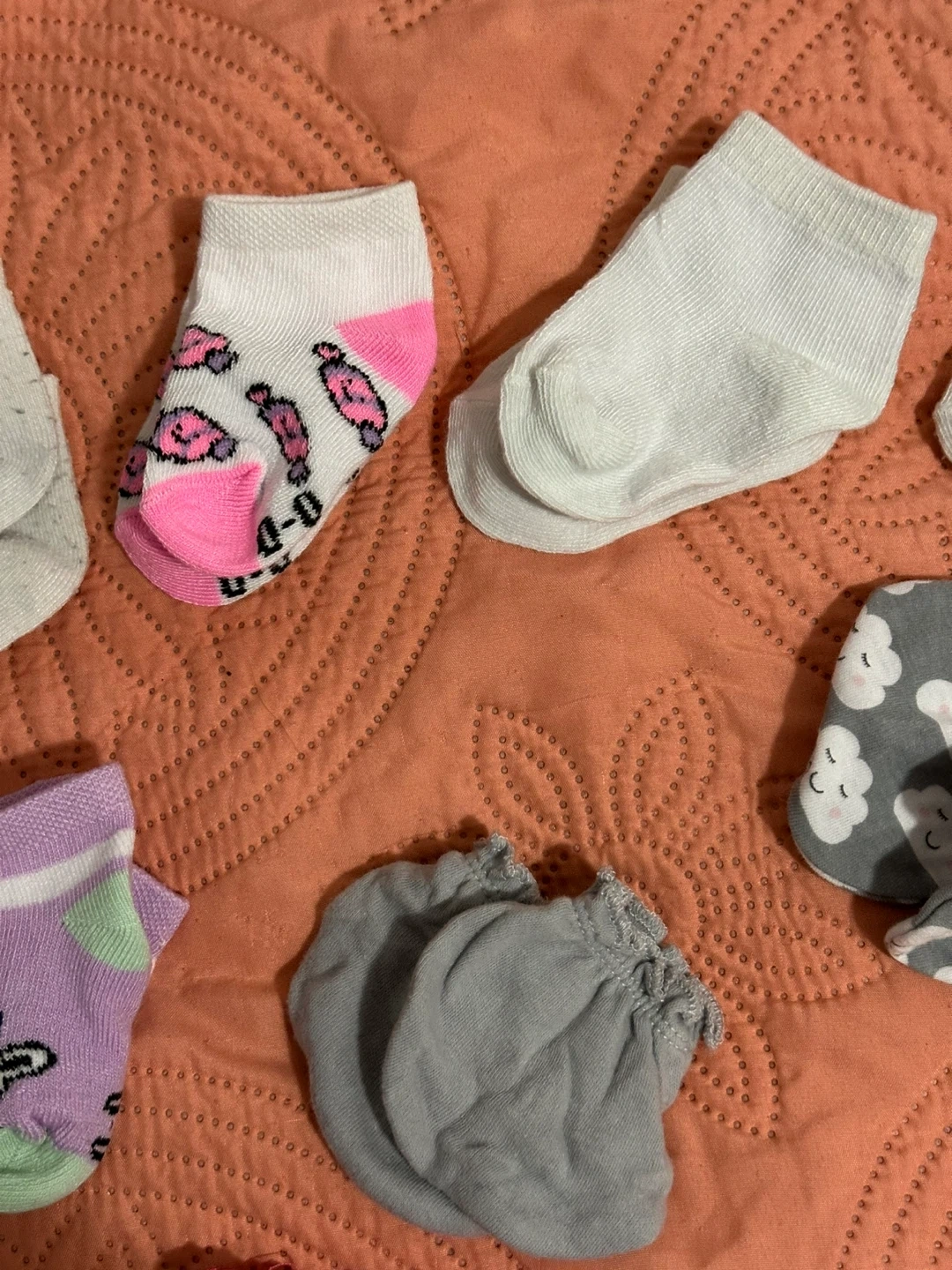 This lot includes a variety of baby socks and mittens for newborn. Items feature cute designs like clouds, flamingos, and other patterns. Perfect for keeping little hands and feet warm and protected. All items appear to be made of soft cotton material.