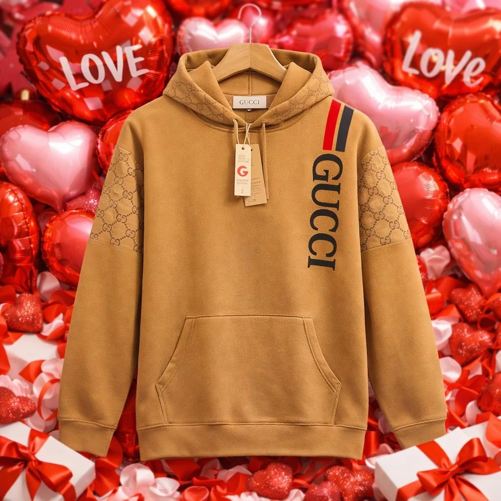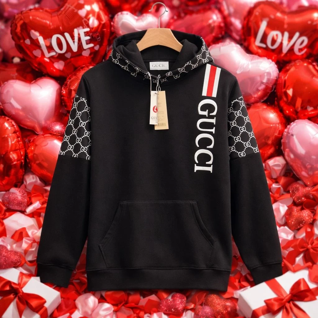 Red Gucci hoodie with vertical logo and pattern on sleeves. Features a front pouch pocket. Cotton blend material.