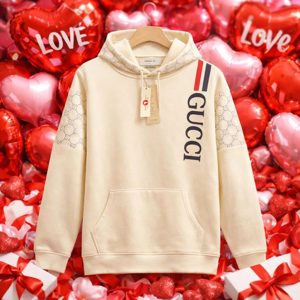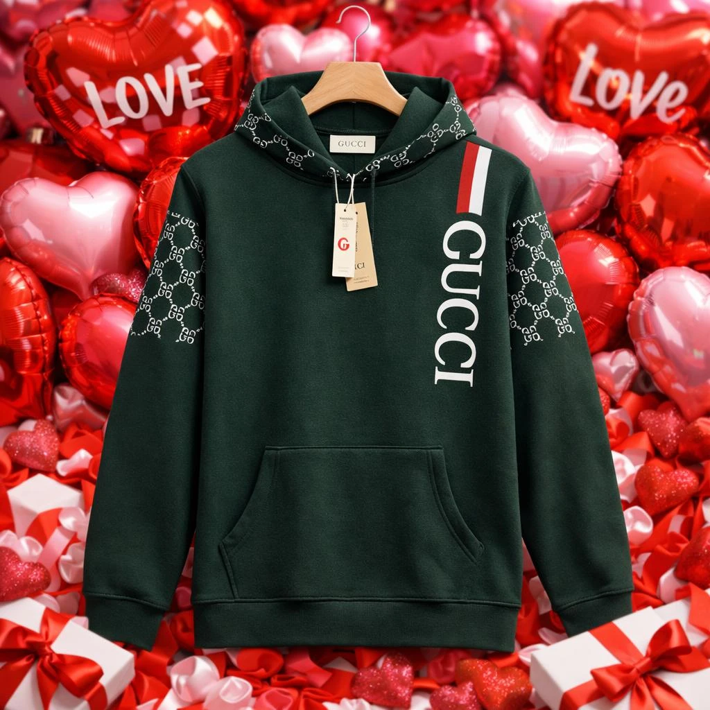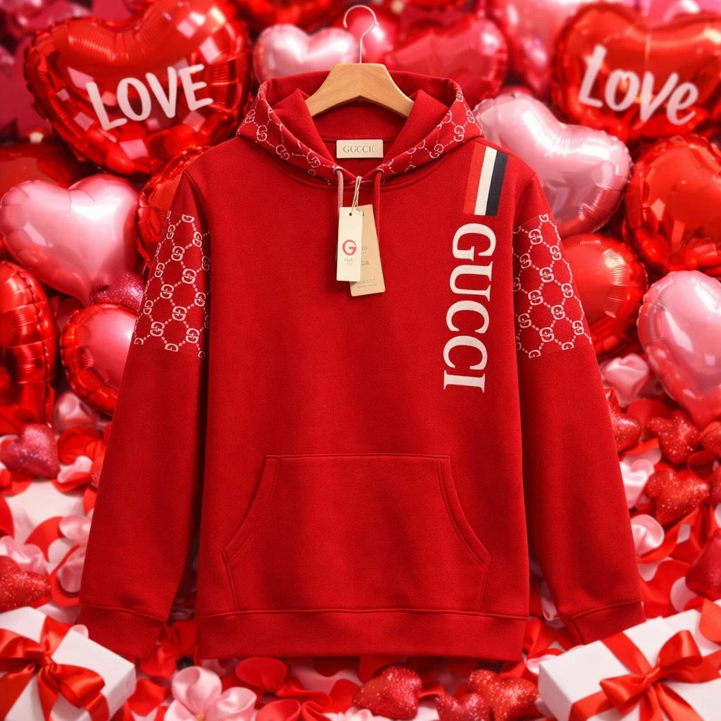 Red Gucci hoodie with vertical logo and pattern on sleeves. Features a front pouch pocket. Cotton blend material.