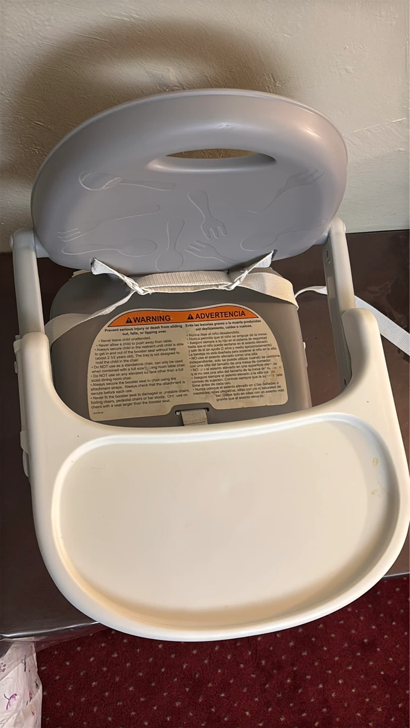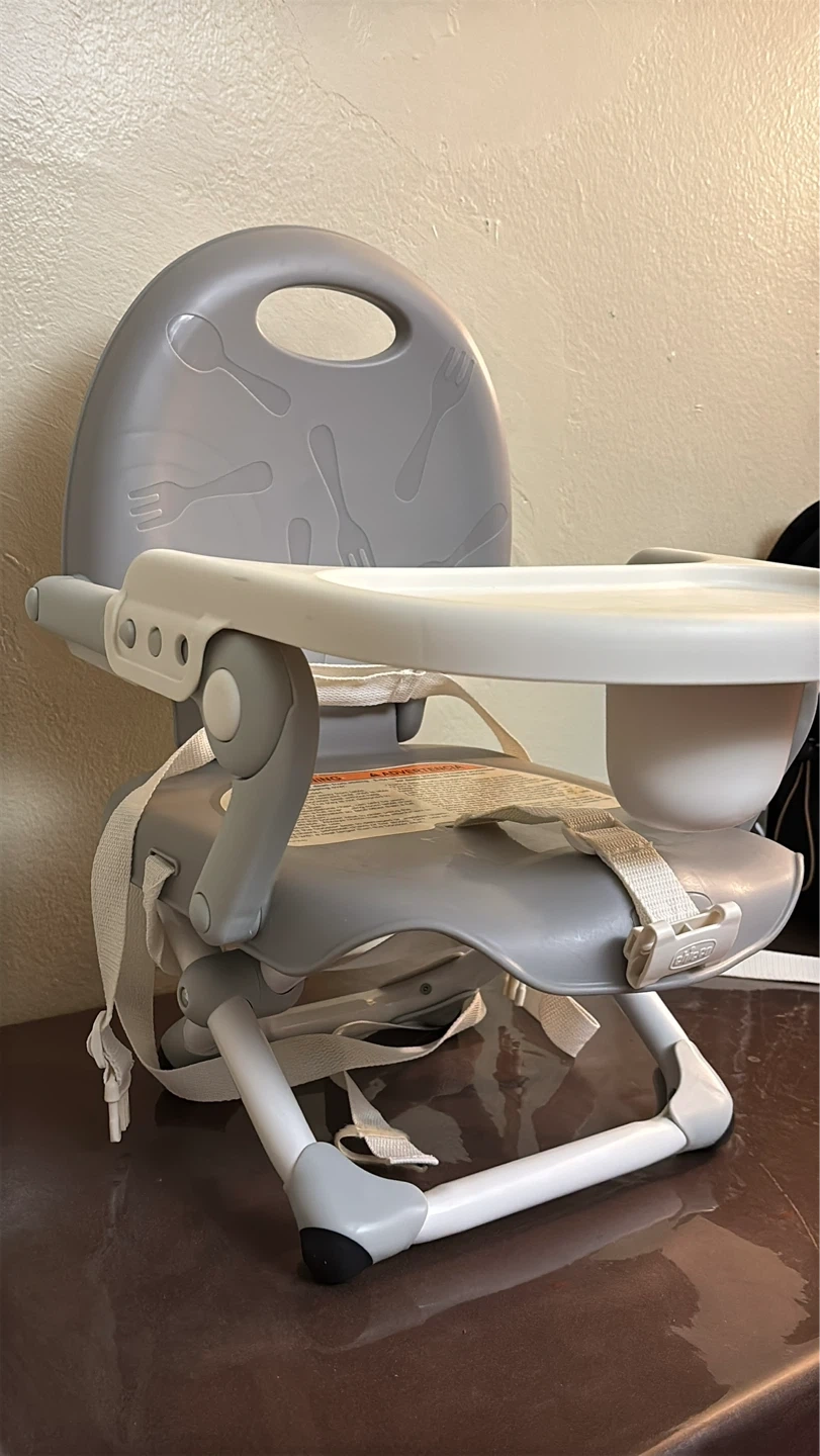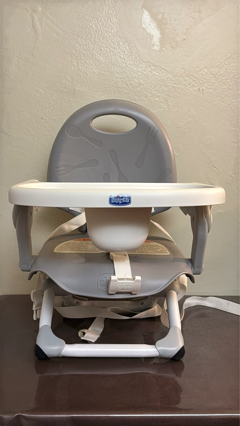 This is a Chicco portable booster seat. It's gray and white with a removable tray. Includes safety straps for securing to a chair.
