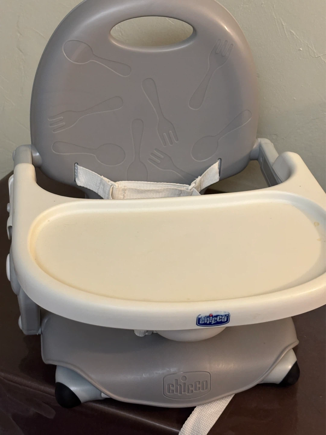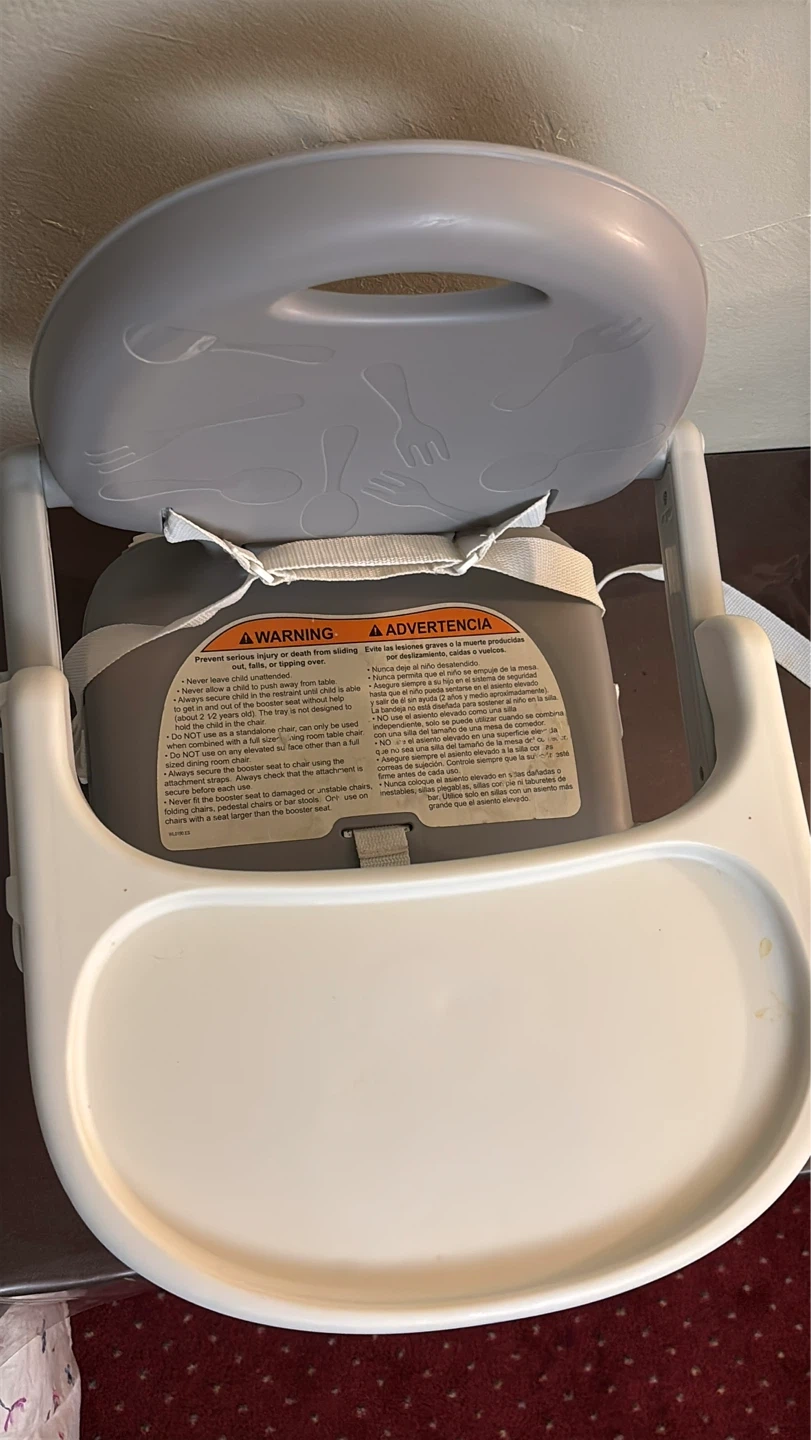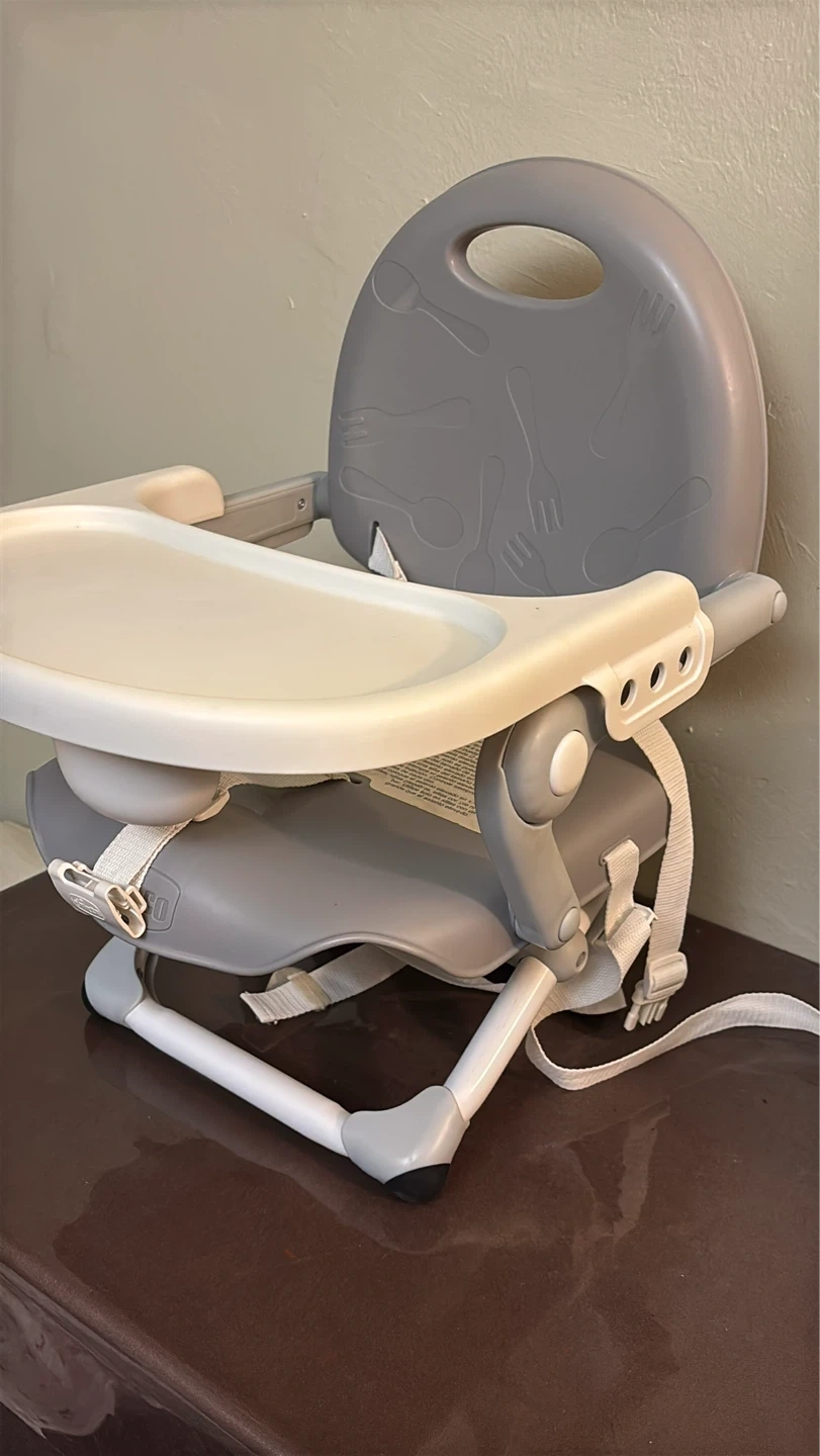 This is a Chicco portable booster seat. It's gray and white with a removable tray. Includes safety straps for securing to a chair.