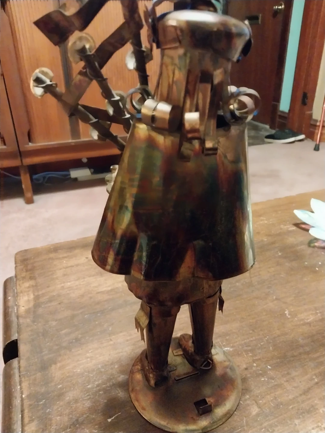 This is a metal figurine of a bagpiper. The piece appears to be made of brass or copper with a patina finish. It's mounted on a circular base. It's a unique decorative item!