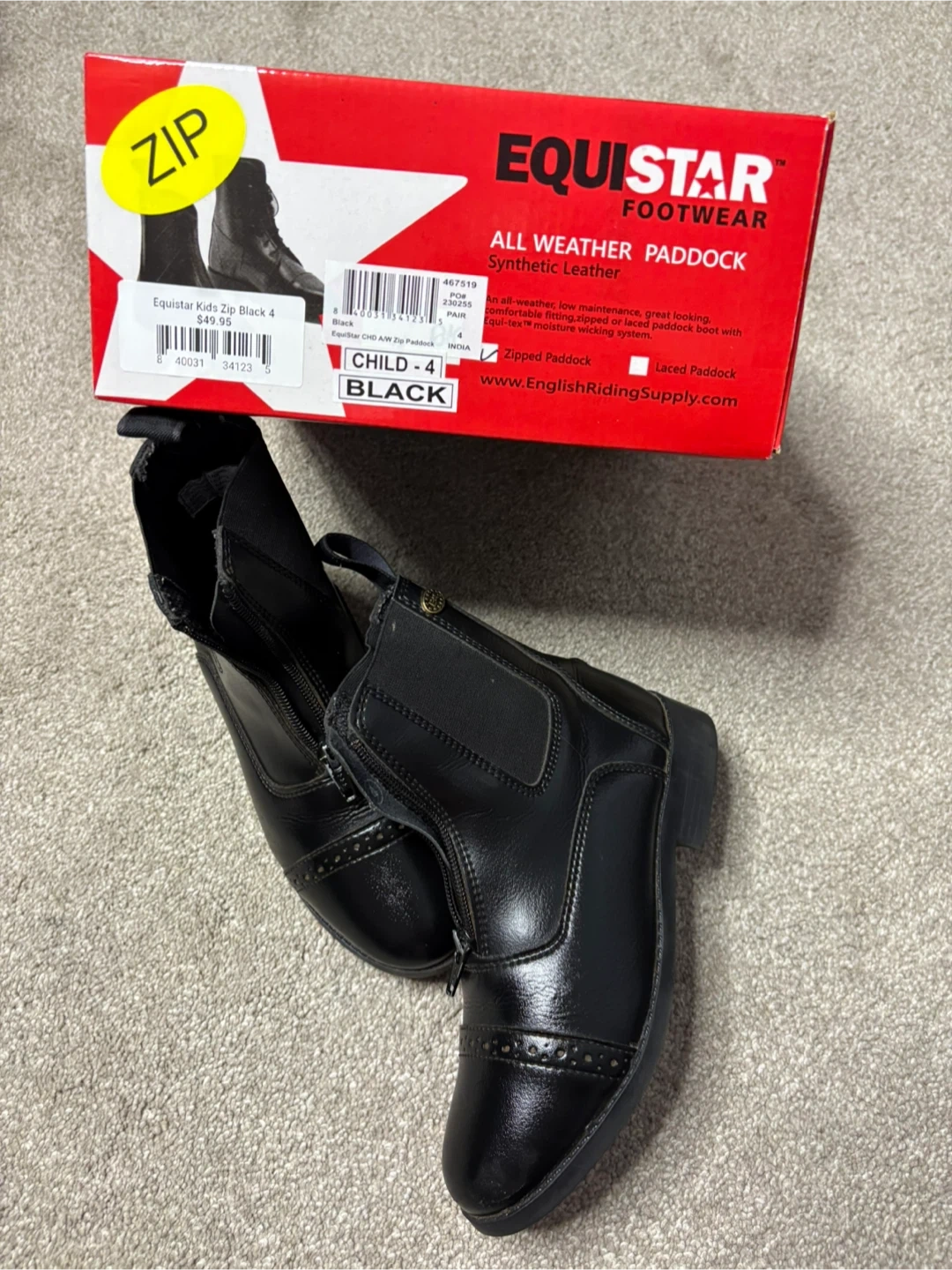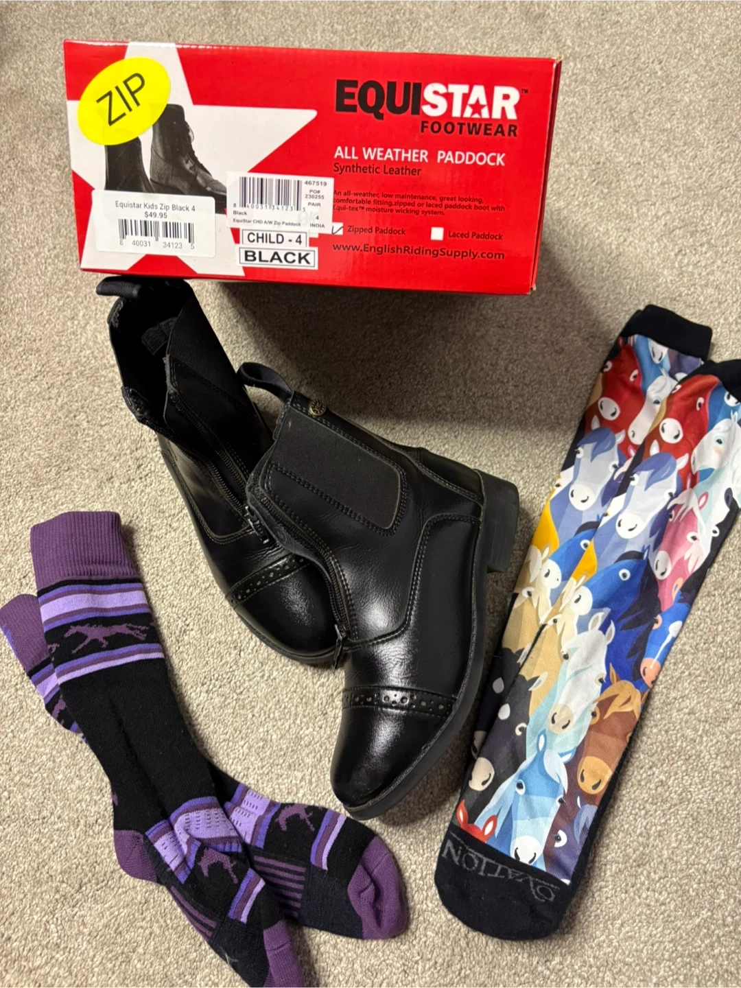 60Selling a pair of Equistar Kids Zip Paddock Boots in black, size 4. These are all-weather boots made with synthetic leather. They feature a zipped paddock style and Equi-Tex moisture-wicking system. Comes with the original box! Only worn a few times and get 2 pairs of riding socks free.