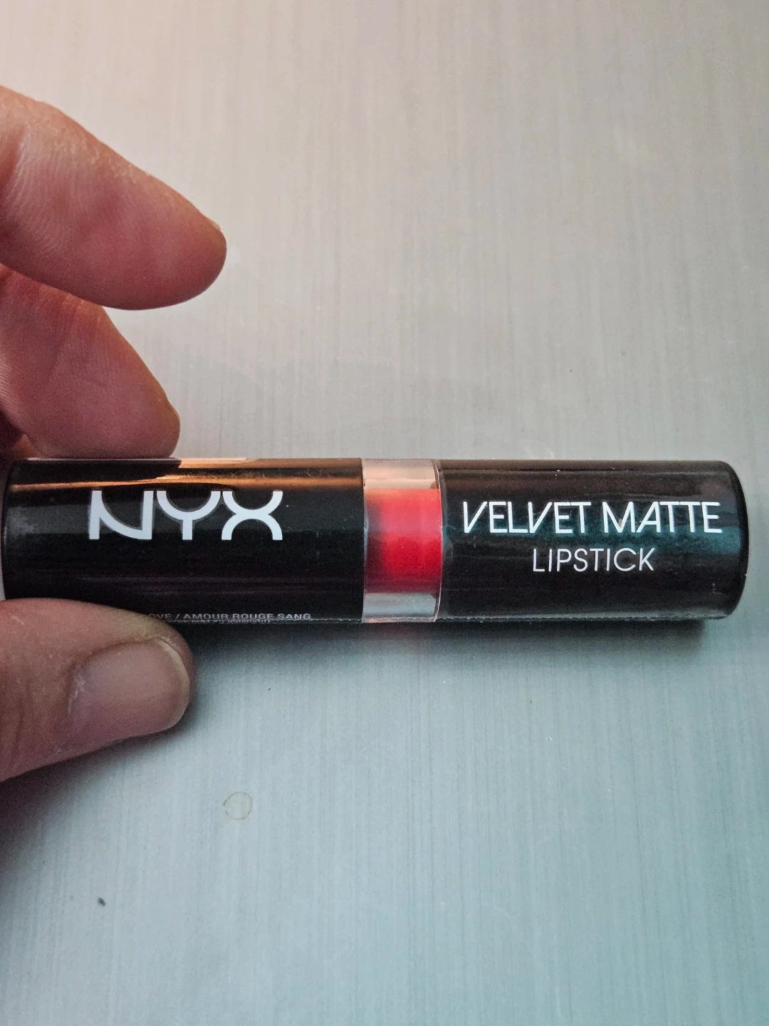 This is a NYX Velvet Matte Lipstick in the shade Blood Love. It's a vibrant red lipstick with a matte finish. The lipstick is housed in a black tube with the NYX logo and shade name clearly printed.