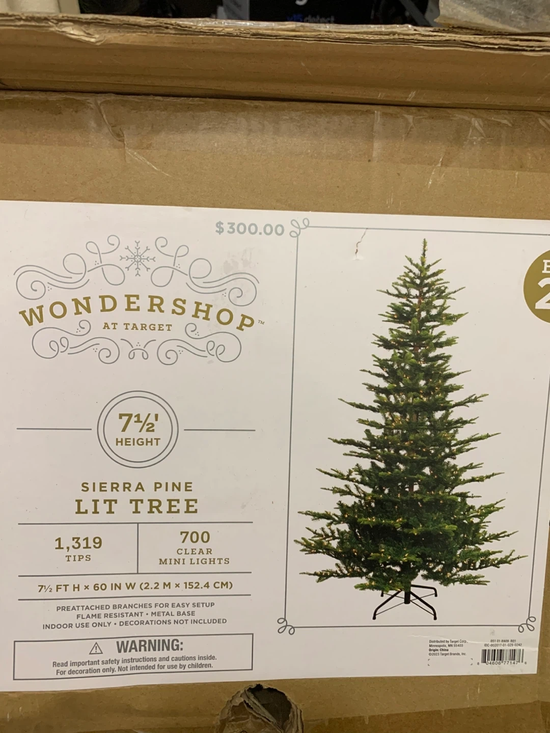 This Wondershop 7.5 ft Sierra Pine lit tree features 1,319 tips and 700 clear mini lights. It's flame resistant with a metal base for easy setup. The tree measures 7.5 ft H x 60 in W (2.2 M x 152.4 CM). Indoor use only; decorations not included. Price is negotiable.