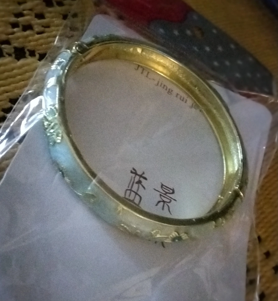 Here's a gold-tone bangle bracelet, still in its original packaging. It has a clasp closure and some floral detailing along the band. It's a lovely piece to add to your jewelry collection