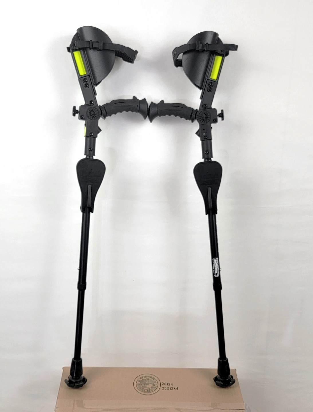 15This shock absorbing cratches are made from metal and plastic. Have light and warning signal. Could be folded to reduce size of the storage. Padded knee rests. No original box.