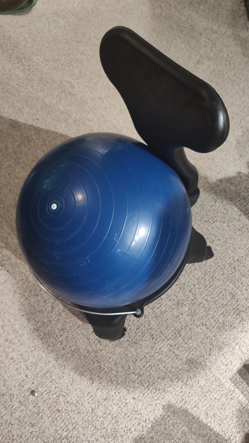 52Balance ball inside a chair frame. Black frame with a back rest. Four small wheels on the base. A great way to create mindful space in your workspace.