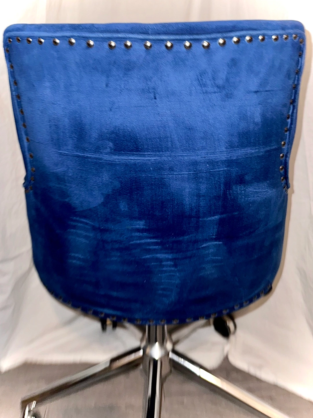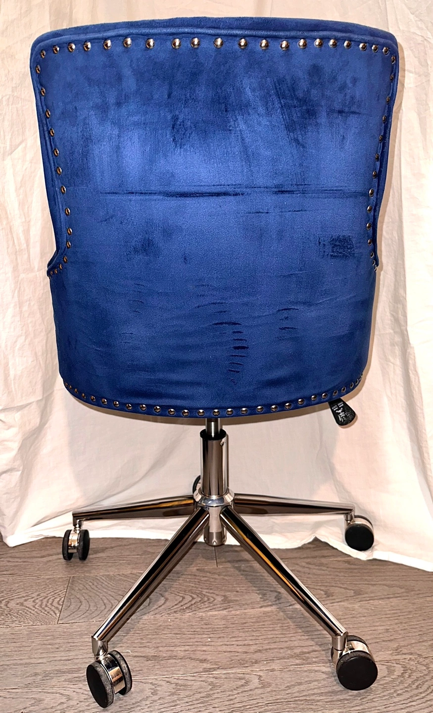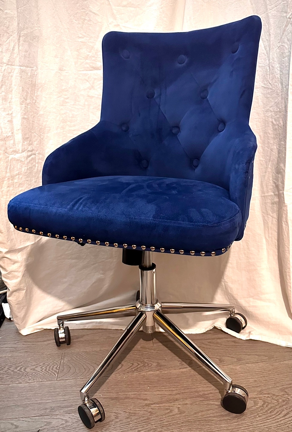 ERGONOMIC LUMBAR SUPPORT - With a thoughtfully constructed contemporary conference chair with ribbed seating, appreciate comfortable luxury. Features a naturally designed shell back which imitates the shape of a human back. Experience lumbar ergonomic comfort from the comfortably reinforced cushioning foam 360 ROTATING SWIVEL CASTORS- For smooth, comfortable, and pleasant rolling throughout your workplace and preventing scratches on your floor, 360 ° swivel plastic casters; rotatable seats are convenient for you to move around and for multi-tasking. MODERN & DURABLE DESIGN- The luxury and quality of this computer desk chair are manifested by the glossy chrome-plated metal frame and navy velvet colored seat. The sleek chrome finishing base also has outstanding features, such as a weight capacity of 250 lbs. Featuring PU leather, the seat is comfortable and plush when being sat on. UNIQUE RETRO STYLE AND NAILHEAD TRIM- The quintessential diamond tufting, showcasing the luxury texture, is combined with plush soft velvet and premium upholstery. Fancy nailhead trim flashes from a distance modernize the living room. The retro-style adds a contemporary look and provides a touch of modern elegance while ensuring safety, stability, and quality. Item Dimensions:W20xD21.6xH31.4-35.4 inches