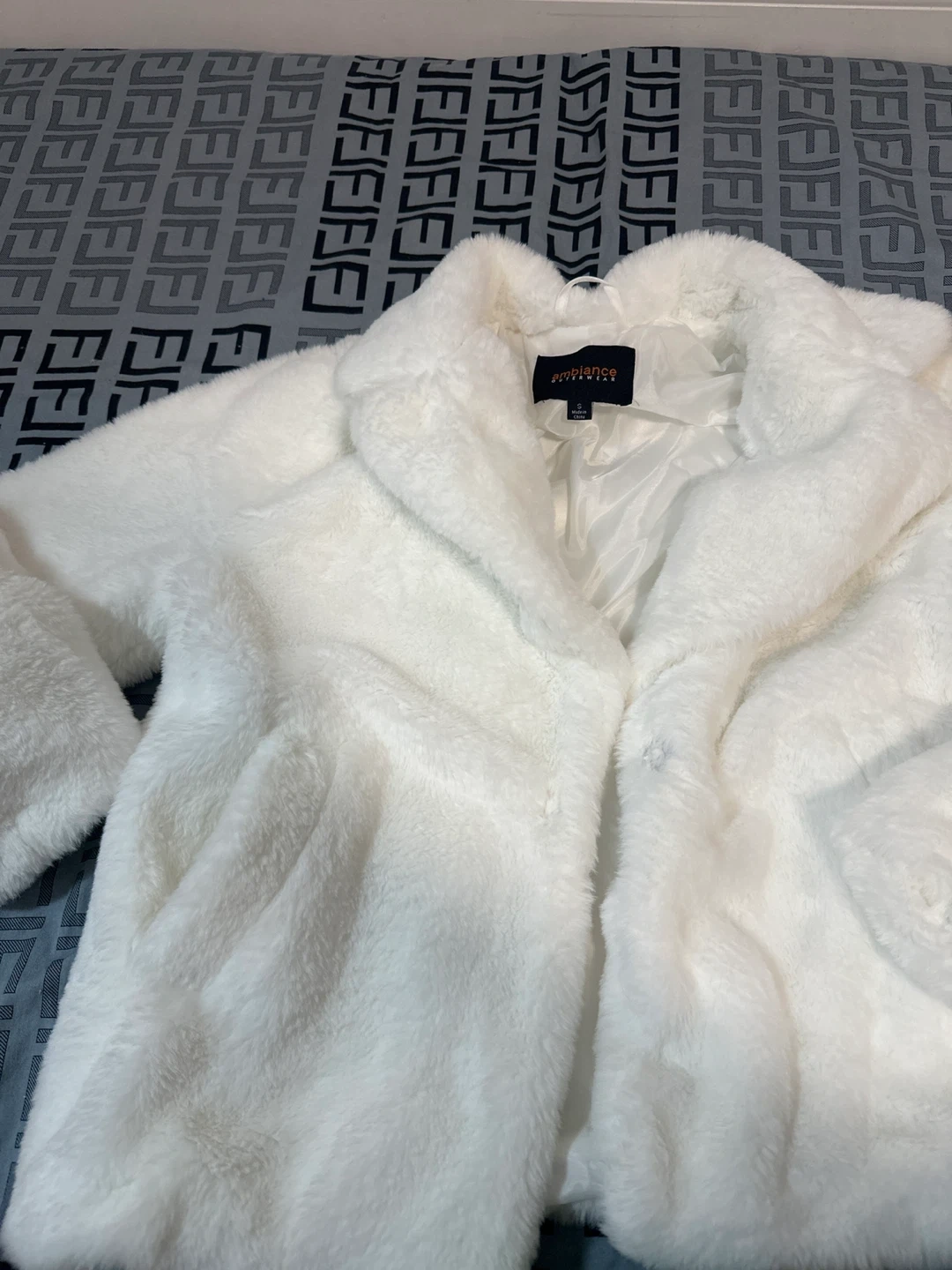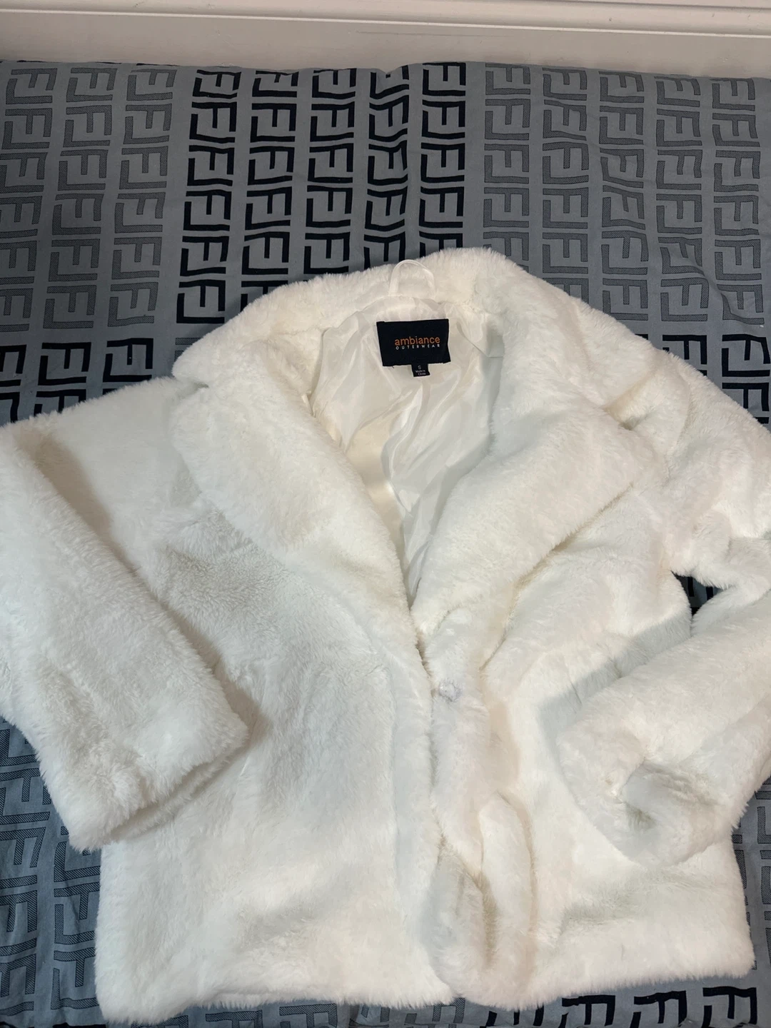 White faux fur coat from Ambiance Outerwear. It's a size small. This cozy jacket's perfect for chilly evenings!100 % new