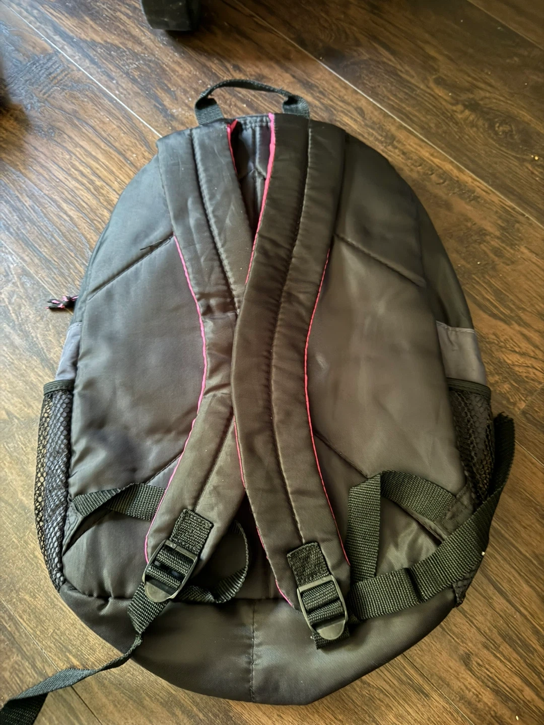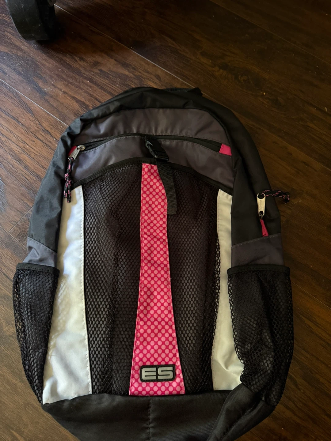 Selling a used ES brand backpack. It features a black, gray, and pink color scheme. It has a mesh front pocket and adjustable straps. Great for school or travel!