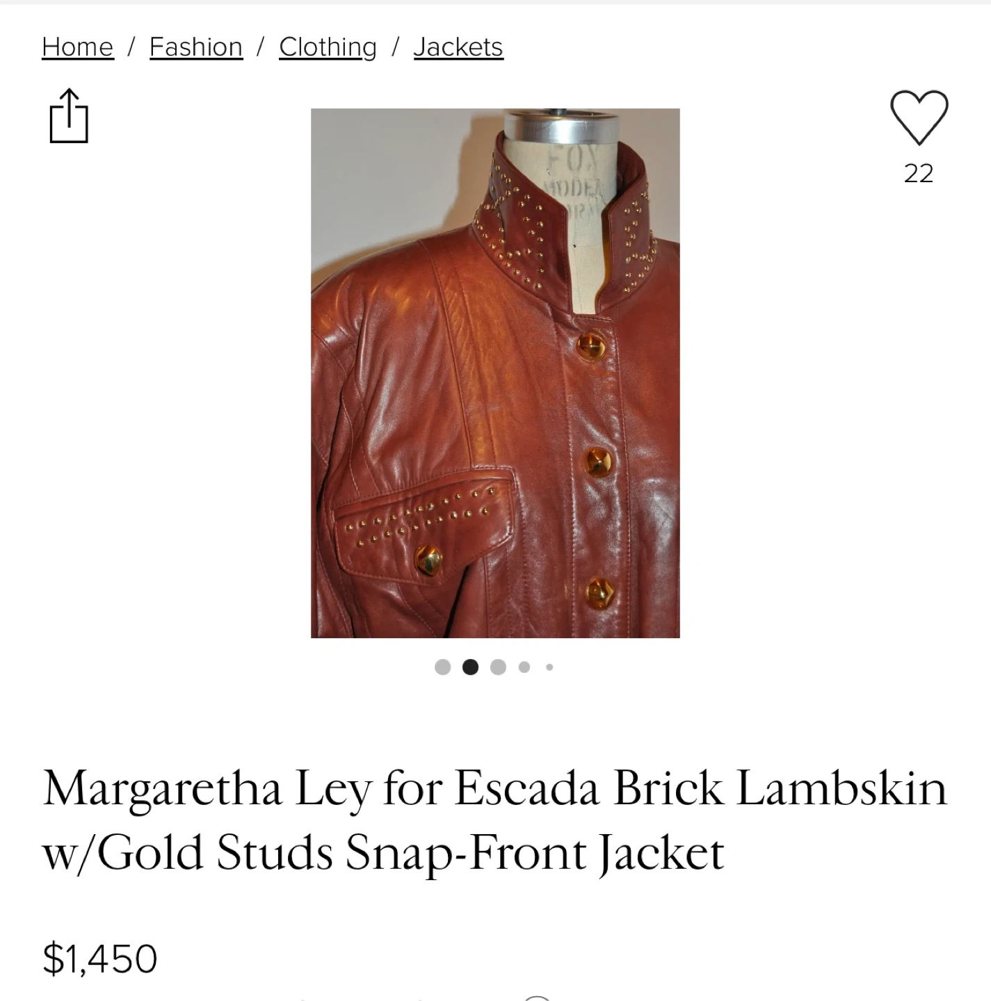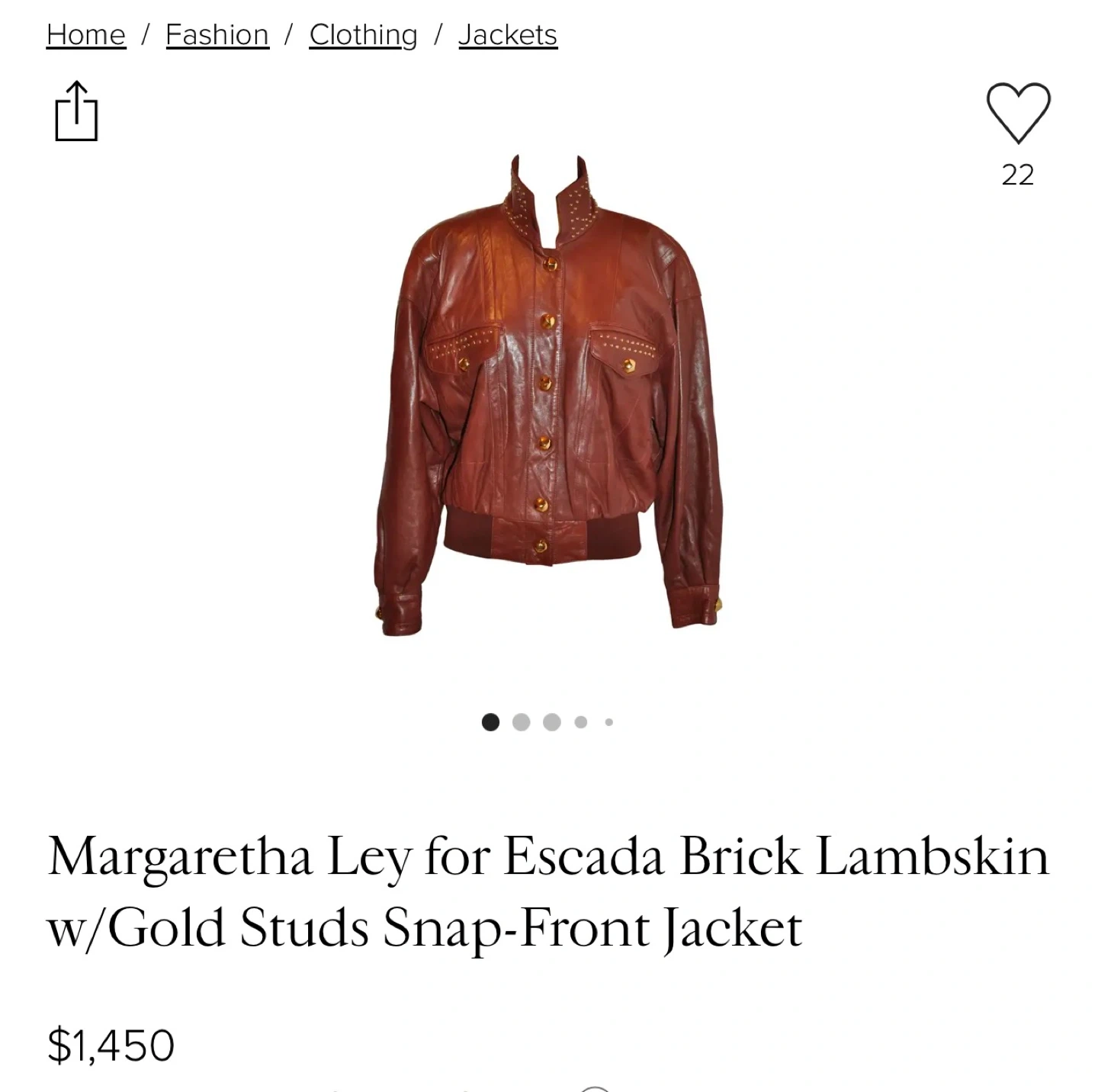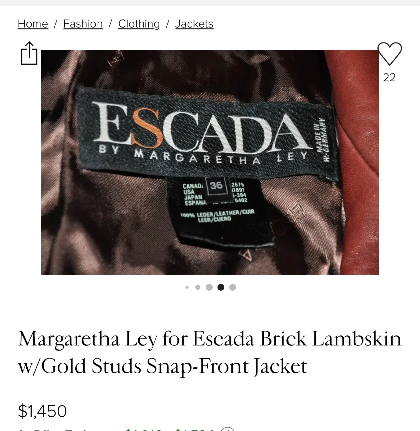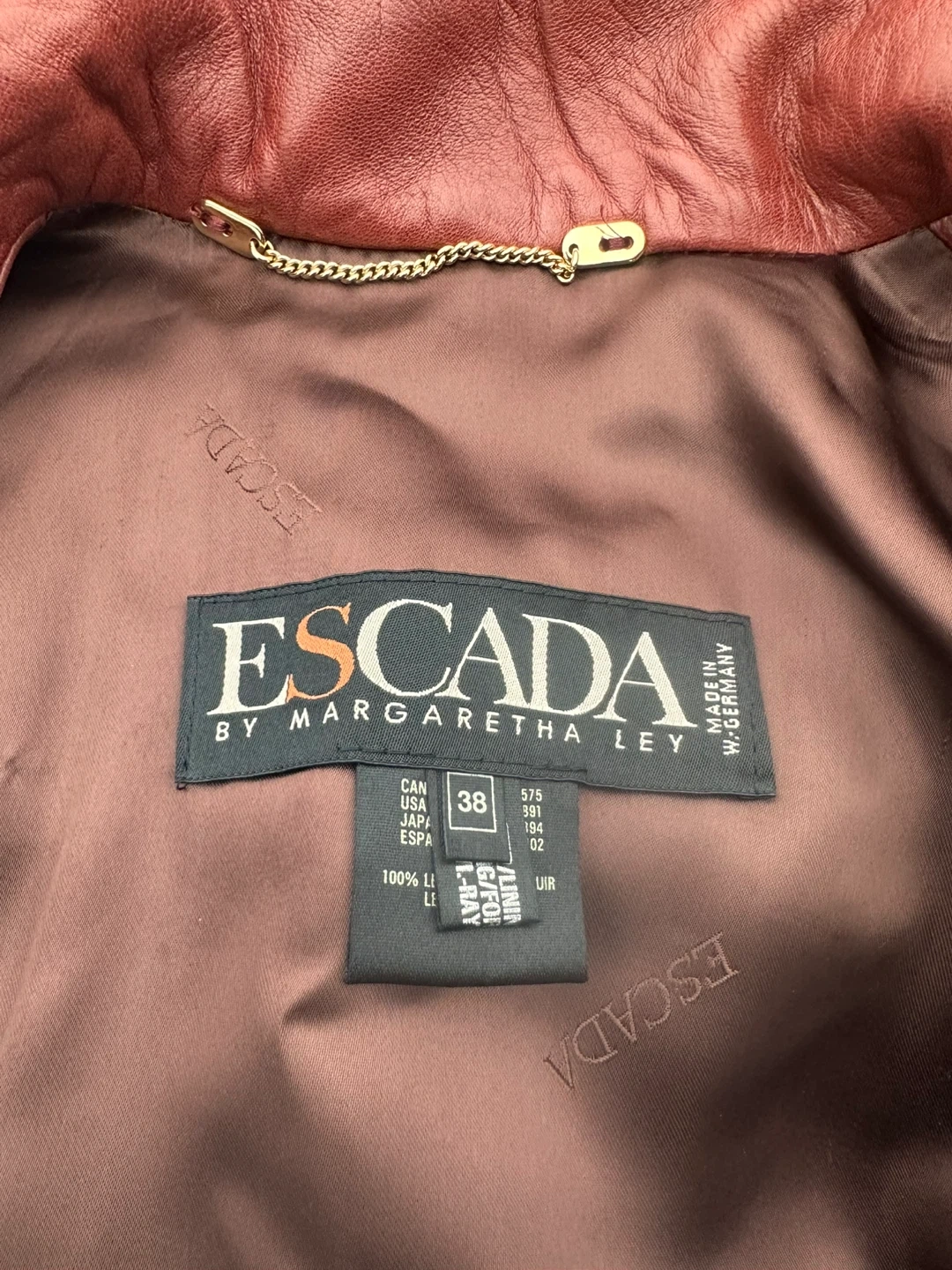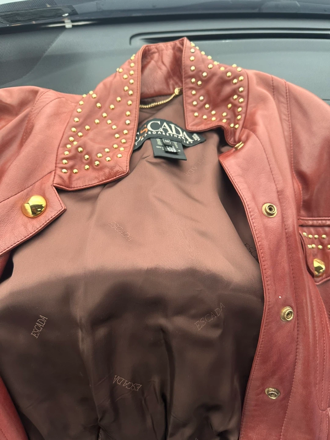 10Selling a beautiful Escada by Margaretha Ley lambskin jacket in a brick color. It features gold stud detailing and a snap-front closure. The jacket is a size 36. It's made of 100% leather/cuero. Originally bought for $1,450!