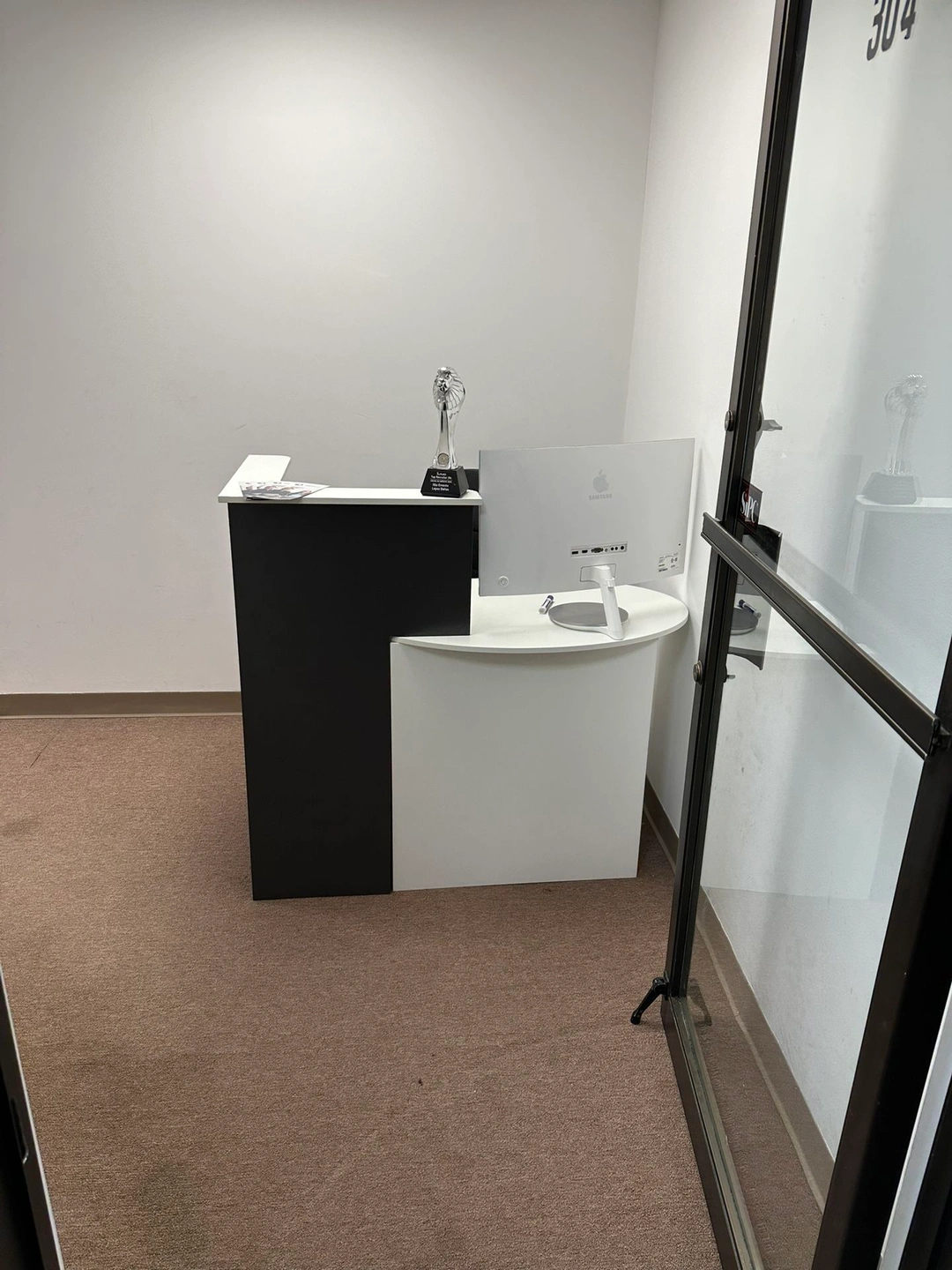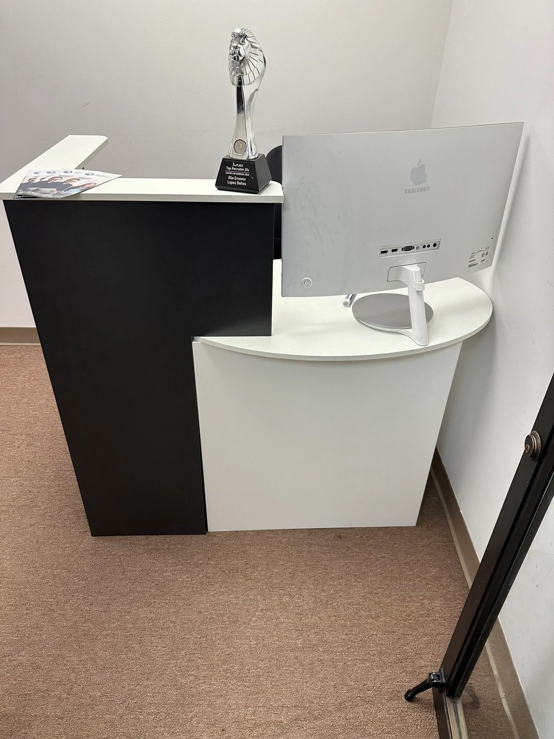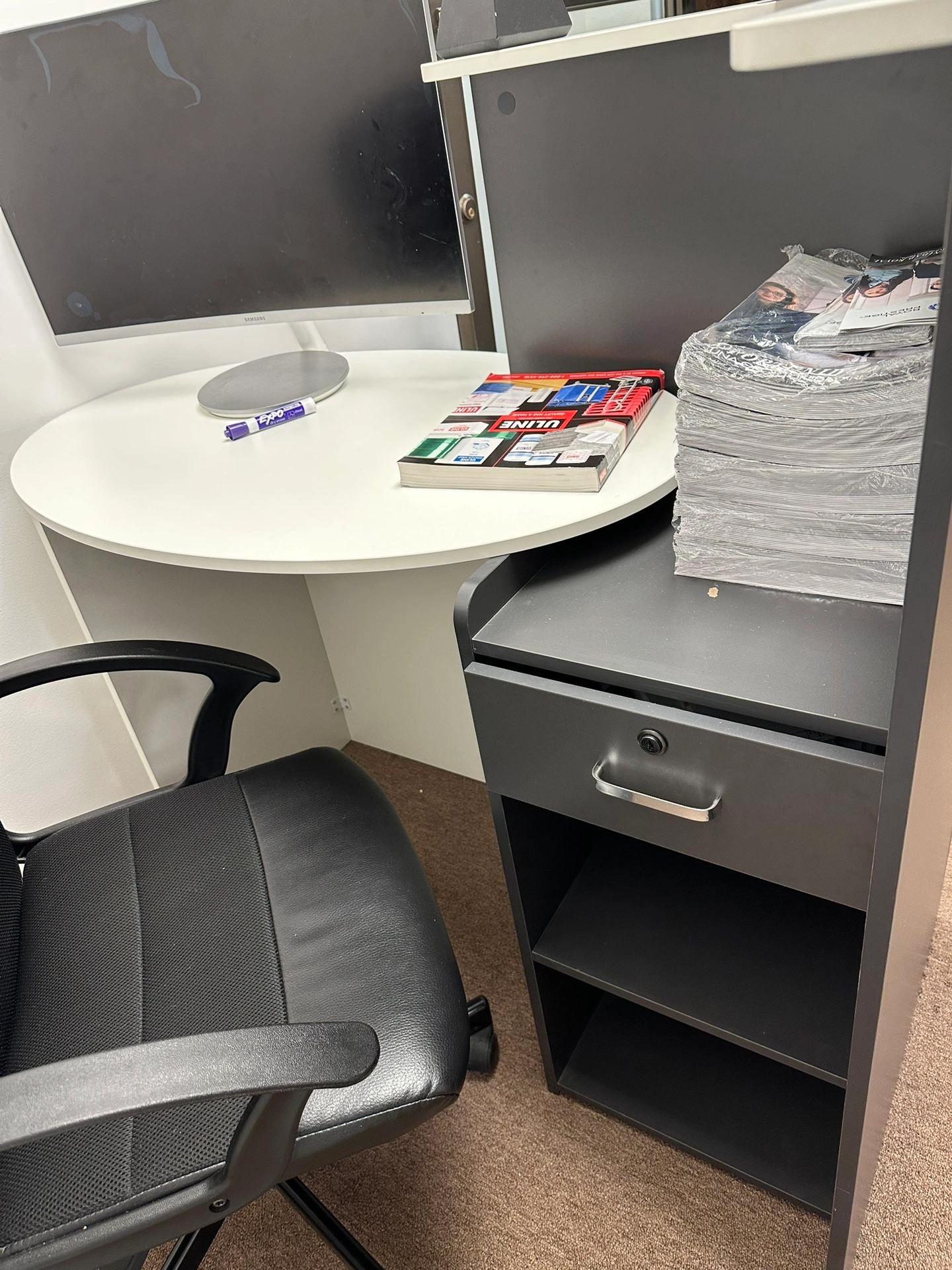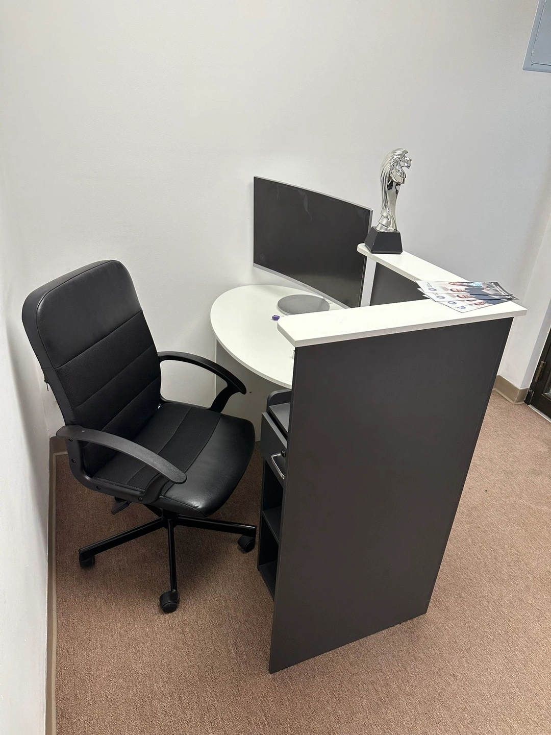 65Compact desk with side shelves for organizing documents or accessories. Elegant and durable design. Wide surface for laptop, monitor or decoration. Black ergonomic chair with padded back and wheels. Perfect for small spaces or office reception.
