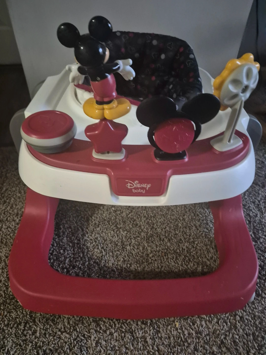 This Disney Baby walker features Mickey Mouse toys and a padded seat. It's designed to entertain and support little ones as they learn to move. Made with durable plastic and fabric.