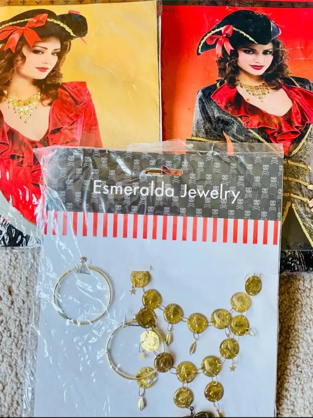 This is an Esmeralda Jewelry pirate costume set! It includes a necklace and hoop earrings.