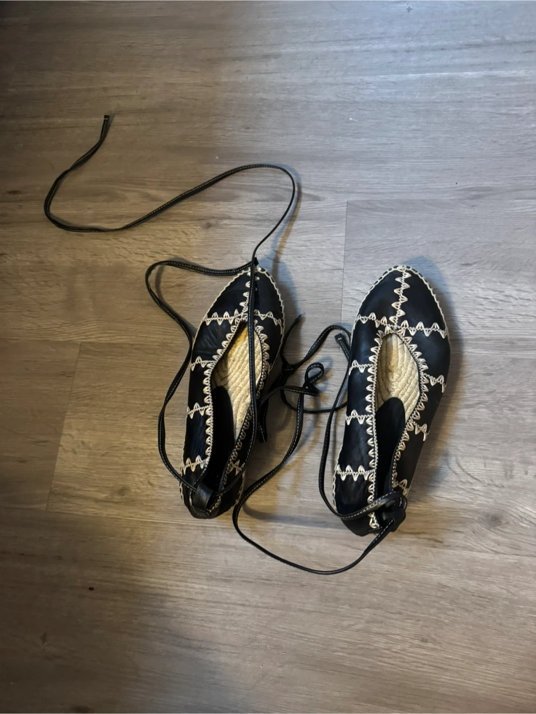 These are a pair of espadrille flats with a lace-up detail. They feature a black leather-like material with decorative stitching and a woven sole. Perfect for a casual and stylish look! LUXURY BOUGHT AT $700 Worn once fits 7.5-8
