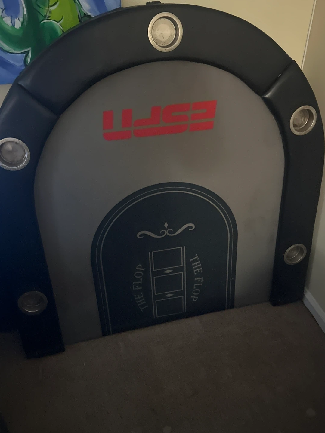 60Selling an ESPN poker table top. It features a gray playing surface with the ESPN logo in red. The table has a black padded rail with built-in cup holders. "The Flop" is printed on the playing surface.
