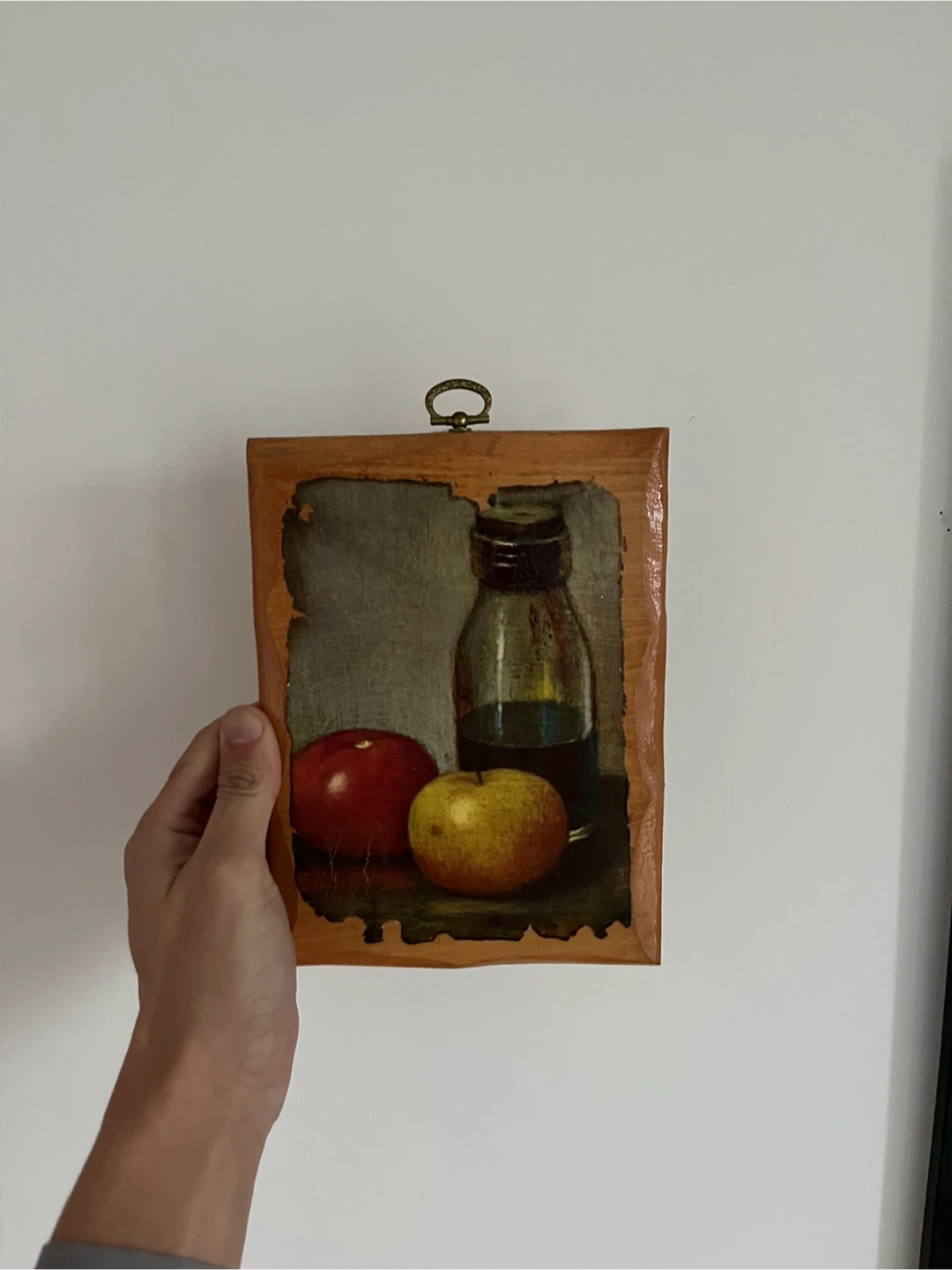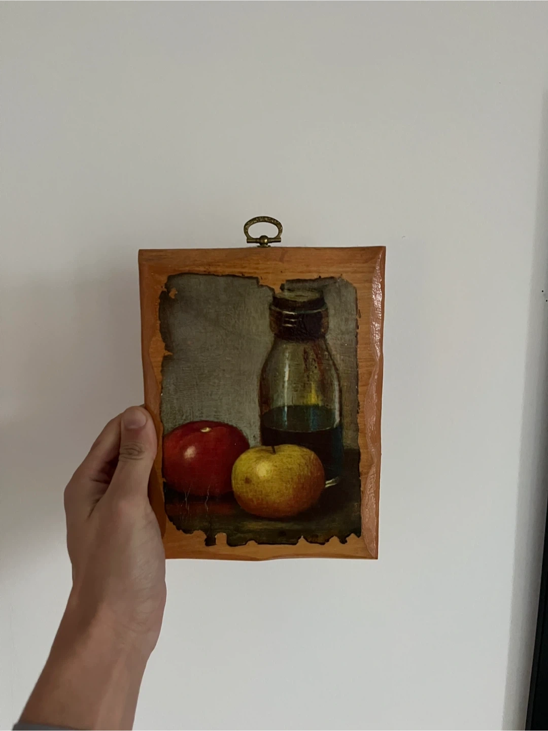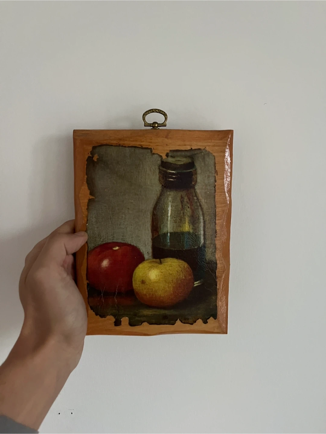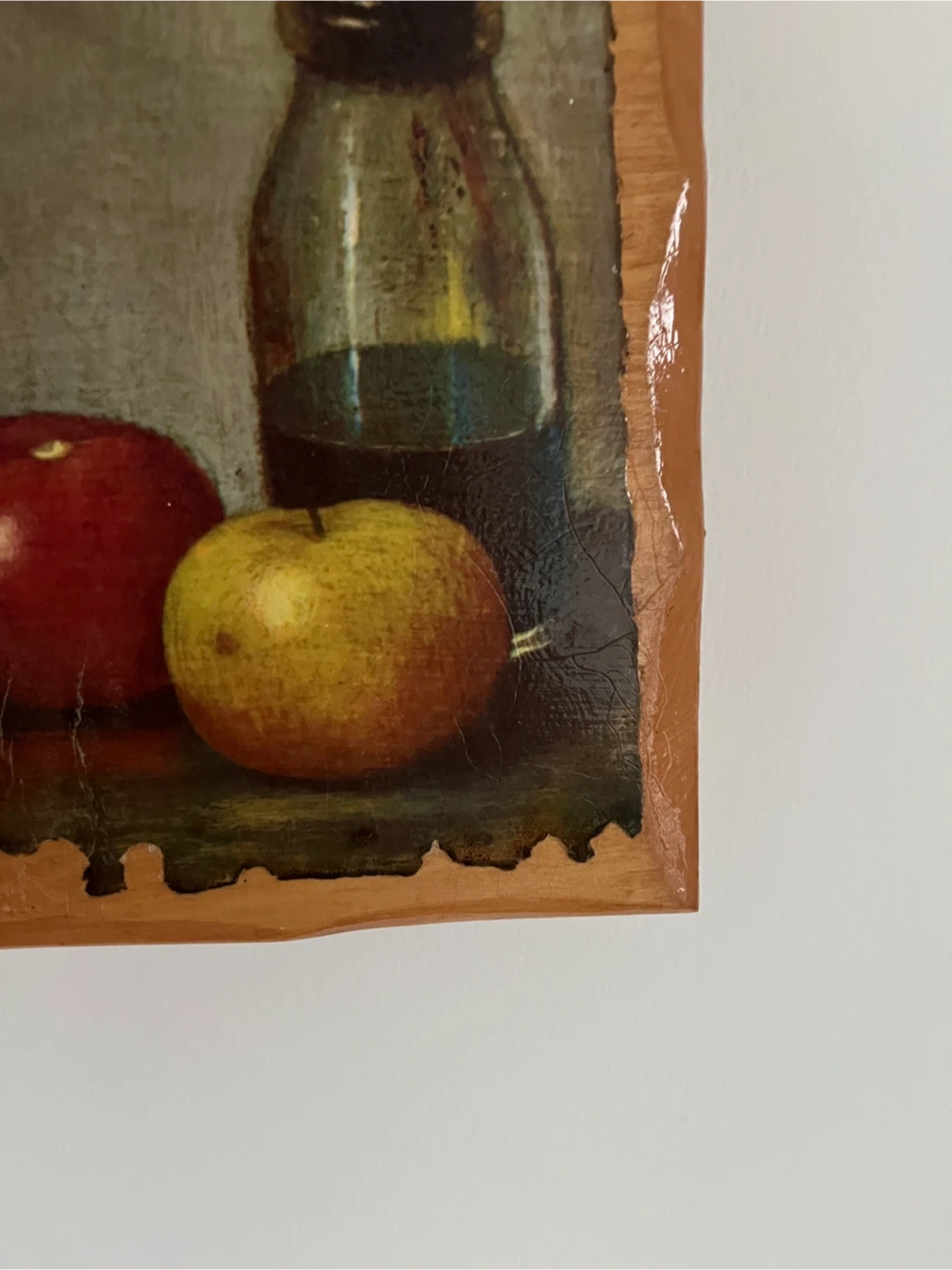 A charming vintage still life painting featuring apples and a bottle, mounted on wood. Hand-signed 'Dot 1978' on the back. This piece would add a touch of retro decor to any room!