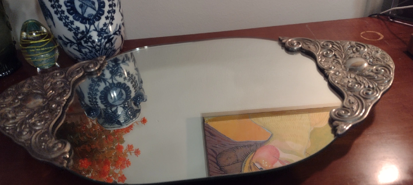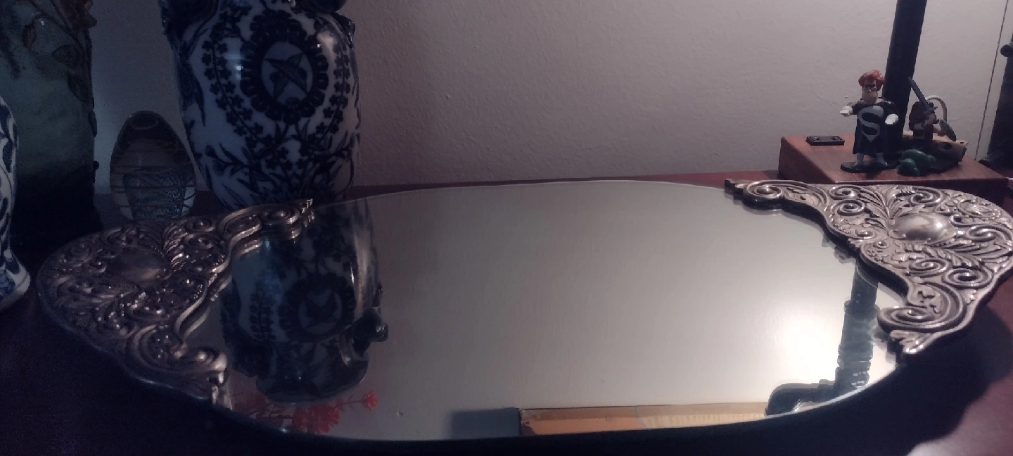 Selling a beautiful vintage vanity tray with ornate silver detailing. It's perfect for displaying jewelry, perfumes, or other small items. And added feature is that it sits approximately an inch off of the surface with little metal legs...It could also be used as a serving tray for small appetizers or drinks. It's in good condition and ready to add a touch of elegance to your home!