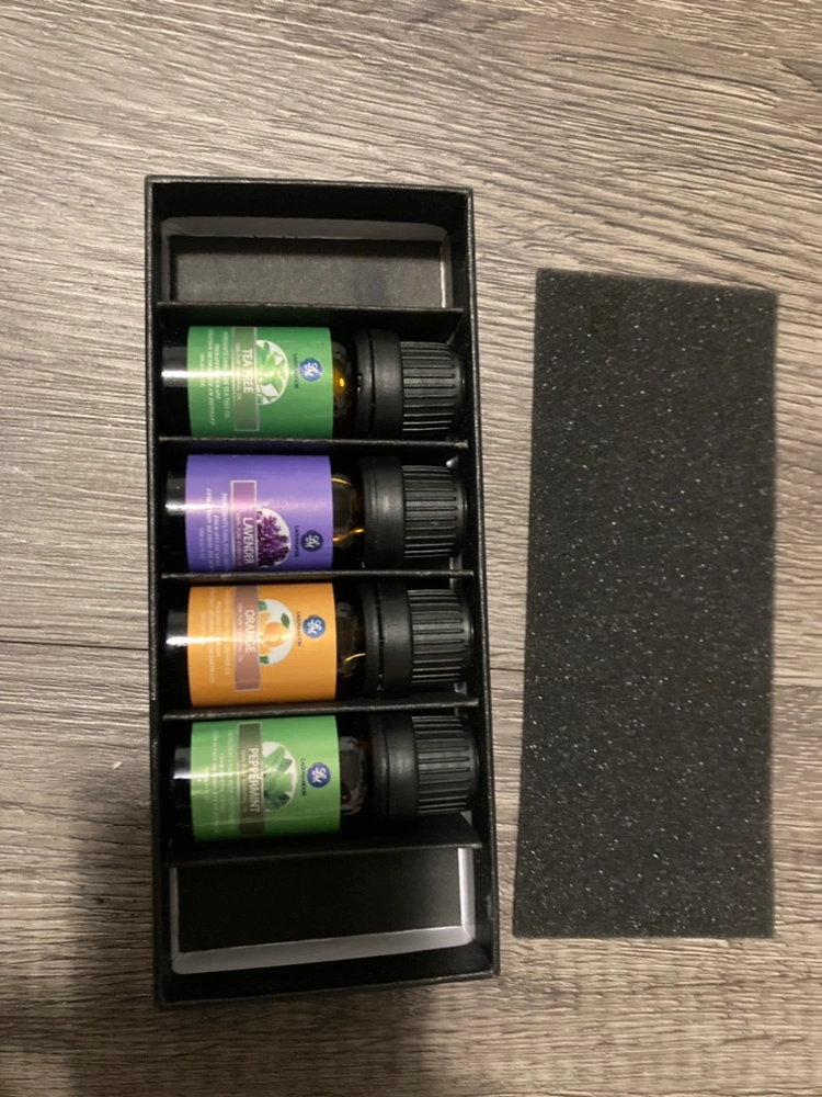 Set of 4 essential oils in a black box with a black foam insert. pick up and by cash 🥕
