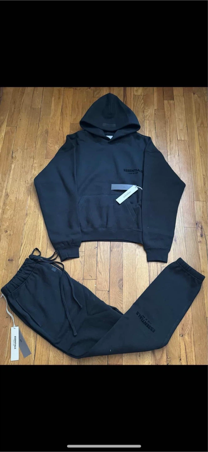 89Selling a medium&large black hoodie and sweatpants set from Essentials Fear of God. The set includes a hoodie with the Essentials logo on the chest and matching sweatpants with the logo on the leg. Perfect for a comfy and stylish look! 220$ each for an set