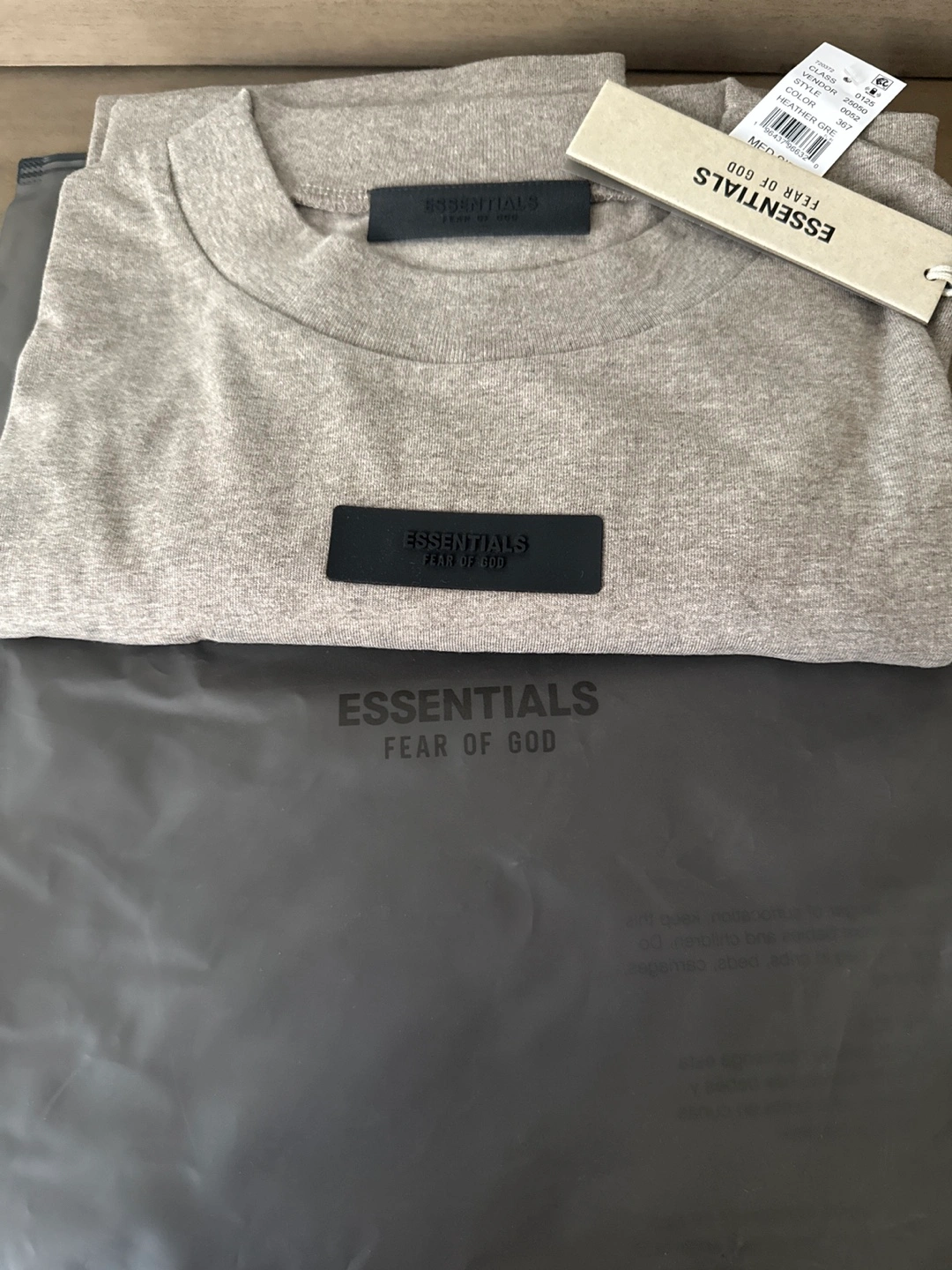 Selling a brand new Essentials Fear of God t-shirt in heather grey! It's a size medium and comes in the original packaging. The shirt features the classic Essentials logo on the front. Feel free to reach out if you have any questions!size M also have it in black