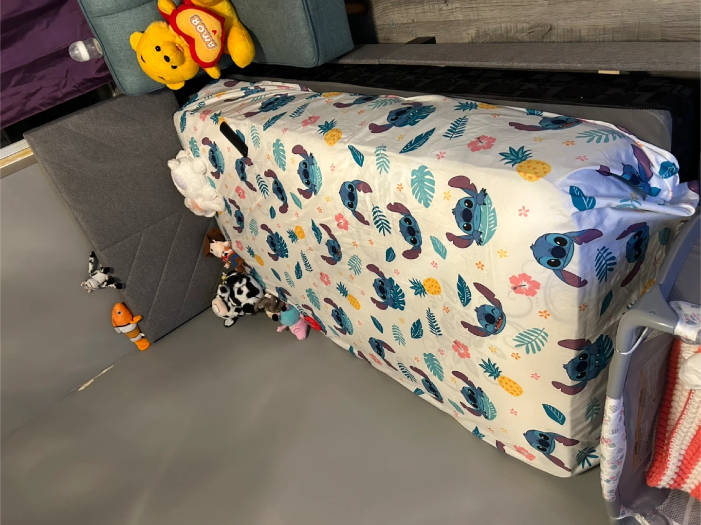 Selling a crib sheet with a fun Disney Stitch pattern! It features Stitch, pineapples, and tropical leaves. It's in great condition and perfect for your little one's nursery