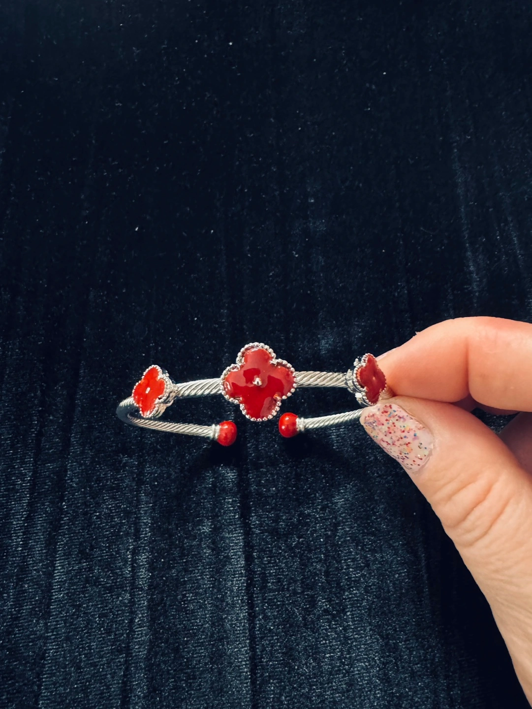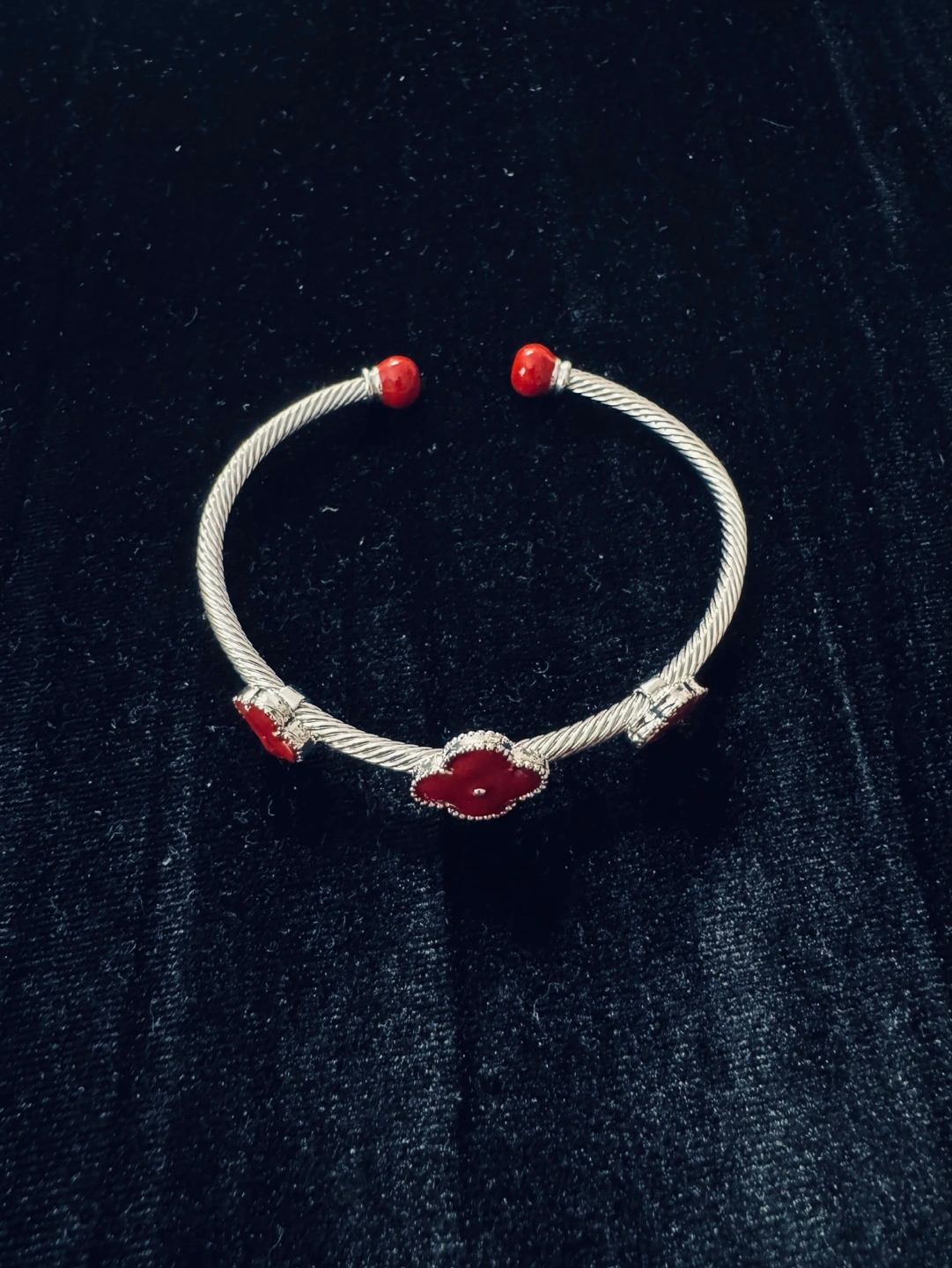 3 Clover REAL RED Enameled SILVER Twist Rope Bangle