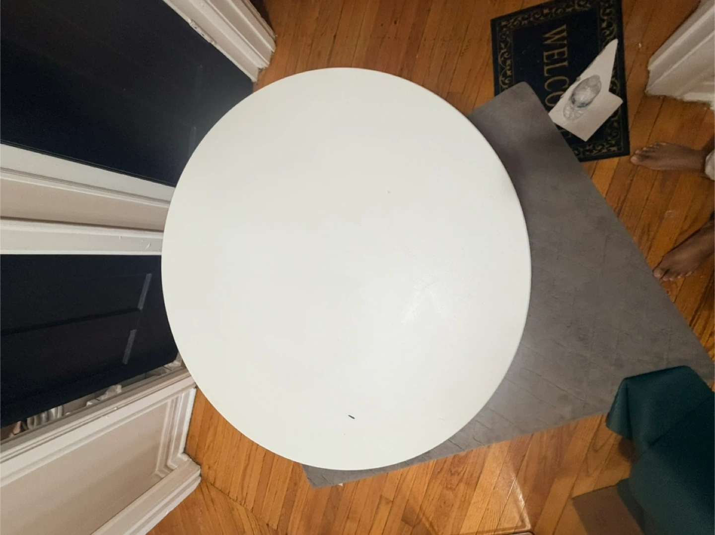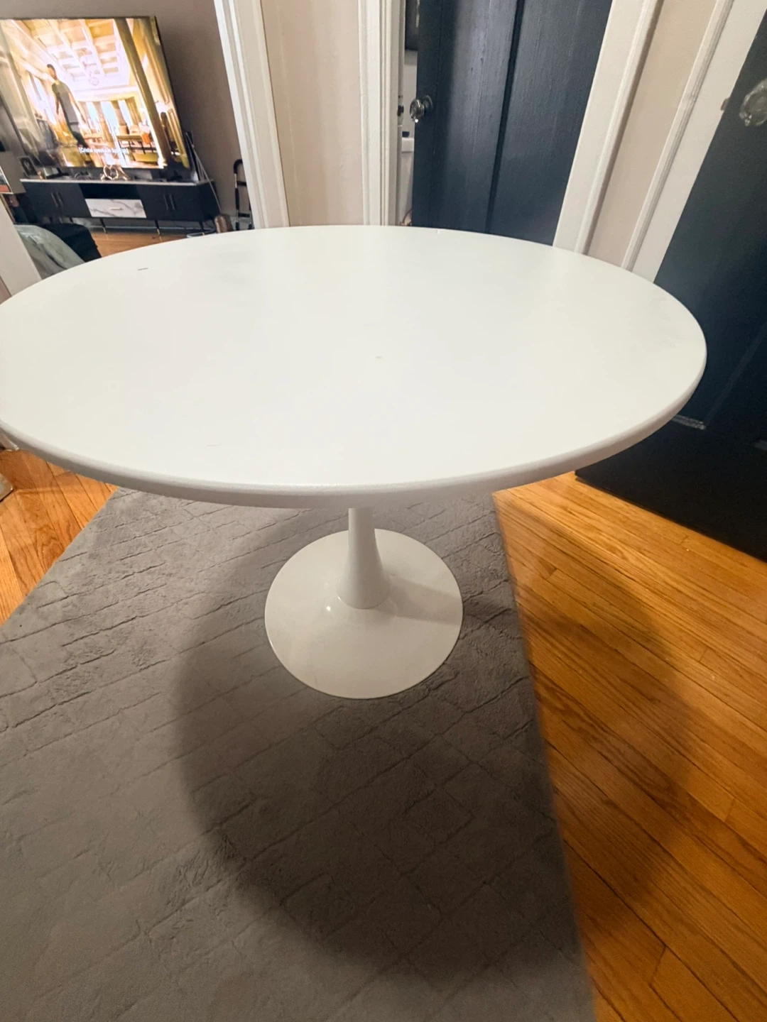 Modern round pedestal dining table. Sturdy and functional. Has some surface stains and minor paint wear on top (priced accordingly). Great for small dining spaces or apartments.