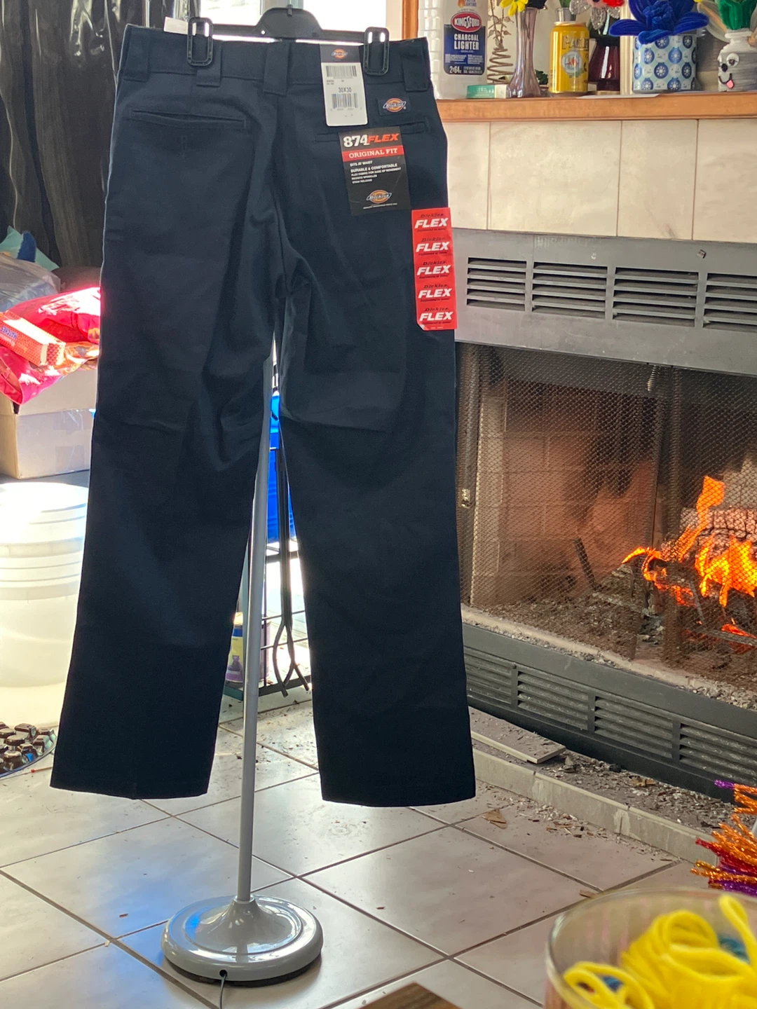 Dickies 874 Original Fit Flex pants in navy blue. These pants are designed for durability and comfort, featuring a classic straight leg. Flex fabric offers ease of movement. They're perfect for work or everyday wear!