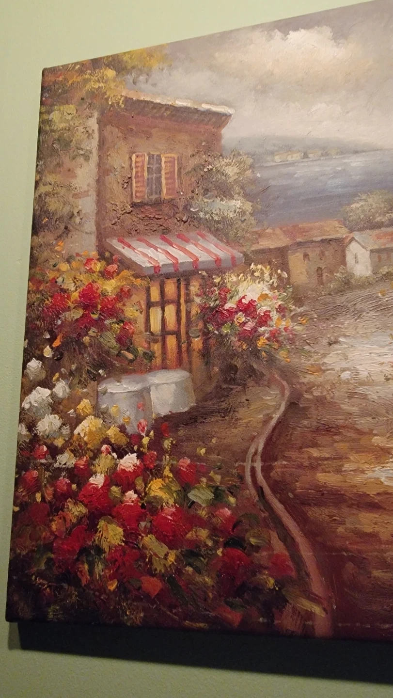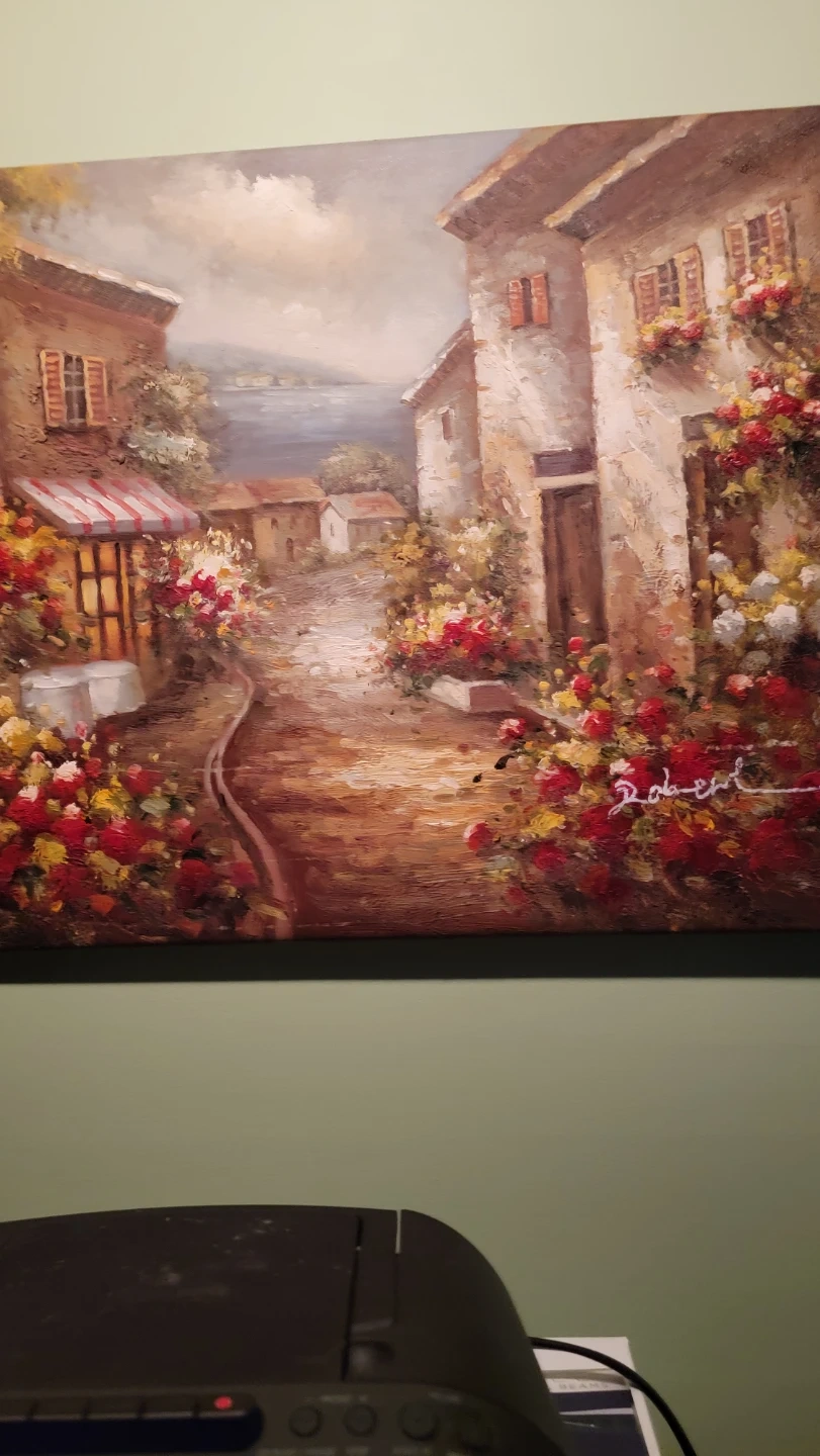 Selling a beautiful Roberts painting featuring an Italian village scene. This piece would add a touch of warmth and charm to any room. The skill by the artist and effects of the paint cannot be captured on my android phone.