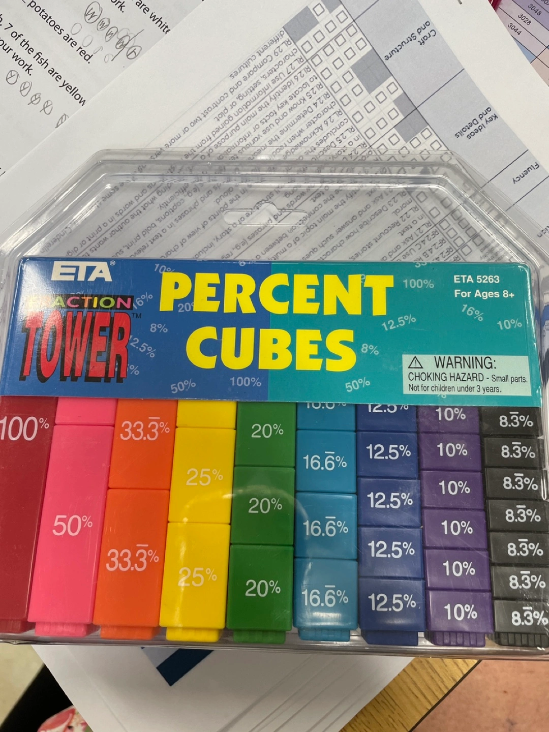 I'm selling a set of ETA Action Percent Tower Cubes! These are great for ages 8 and up. They help kids learn percentages in a hands-on way. There are different colored cubes with percentages like 100%, 50%, 33.3%, 25%, 20%, 16.6%, 12.5%, 10%, and 8.3%