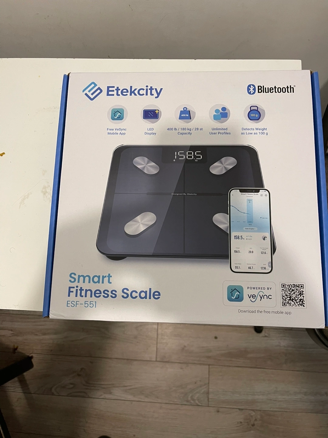 82Selling a brand new Etekcity Smart Fitness Scale, model ESF-551! It's still in its original packaging and has never been used. Key features include: - Free VeSync Mobile App integration - LED display - Capacity up to 400 lb / 180 kg / 28 st - Unlimited user profiles - Detects weight as low as 100 g - Bluetooth connectivity
