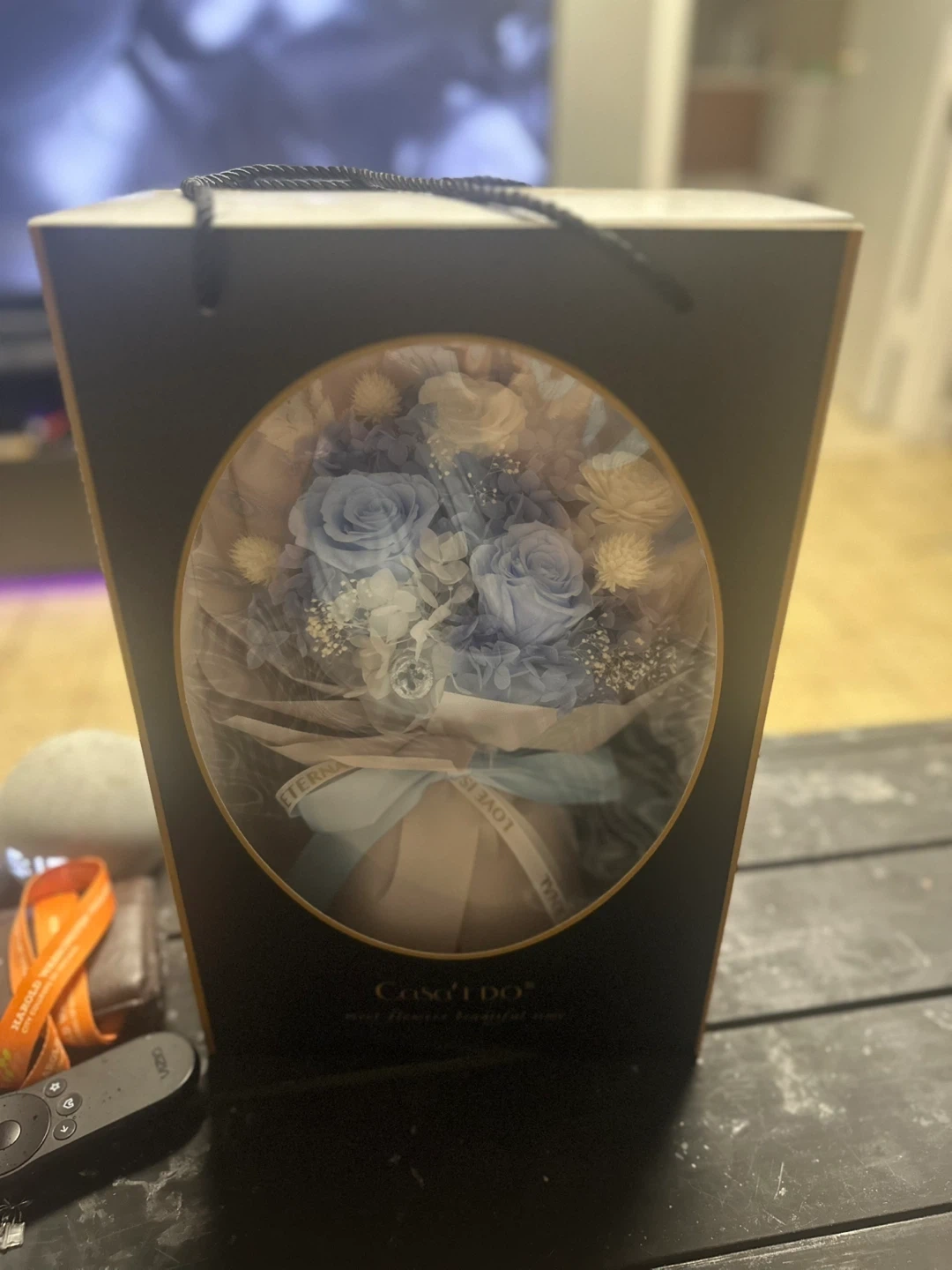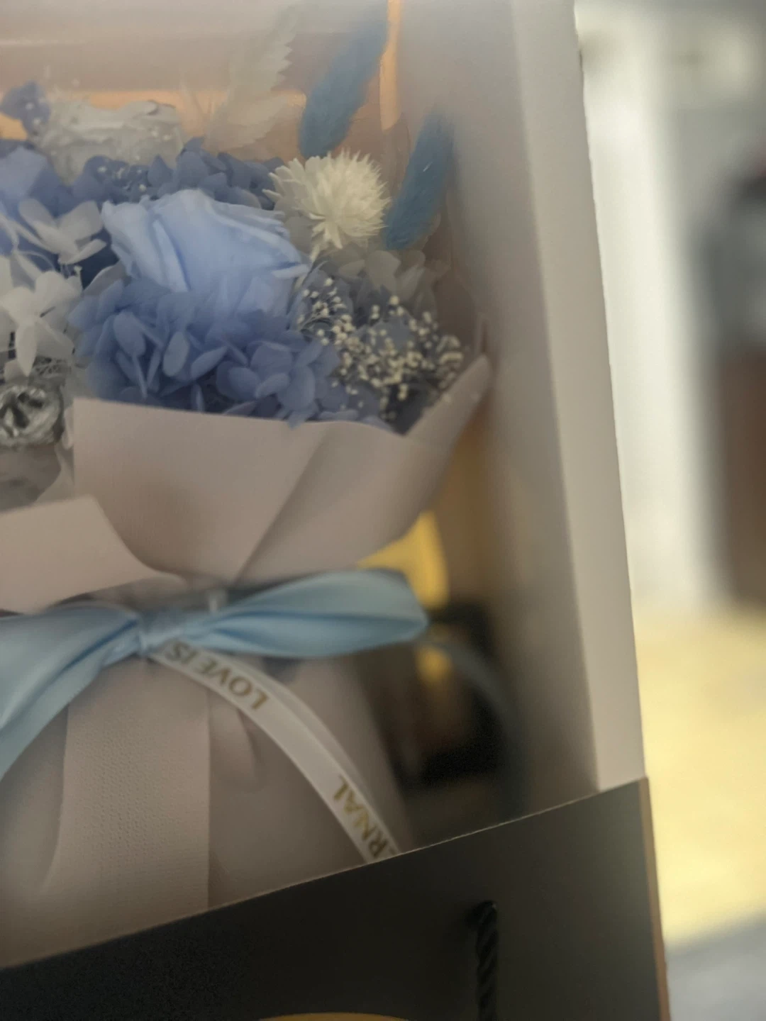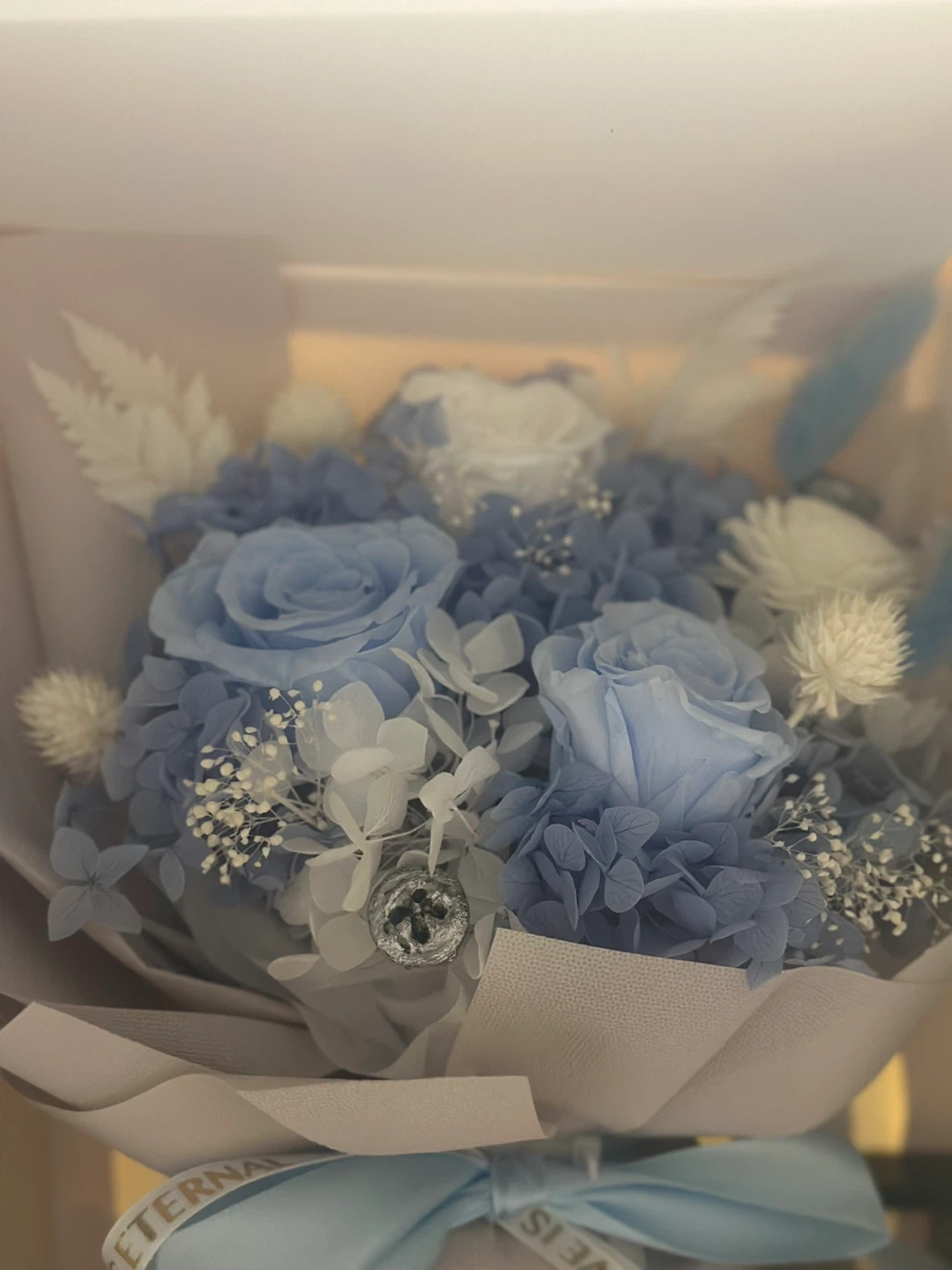 Selling a beautiful eternal flower bouquet! It comes in its original box and features a lovely arrangement of blue and white flowers. This bouquet is a perfect gift or an especial occasion π