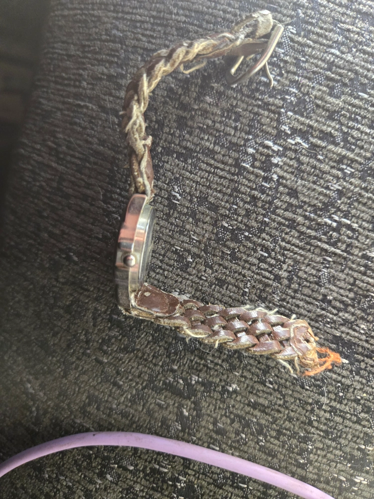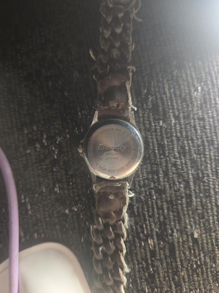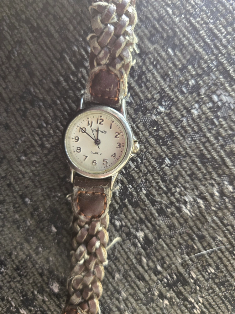 Selling an Eternity Quartz watch. It has a stainless steel caseback and metal base. The band is braided.